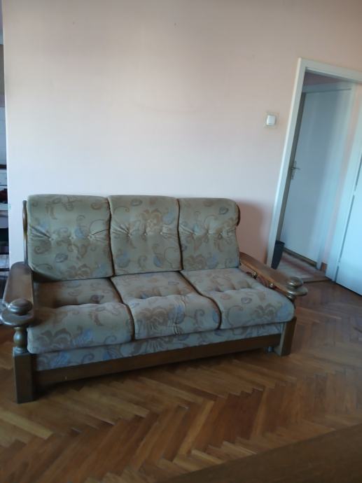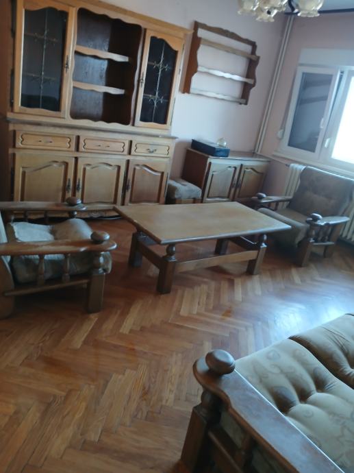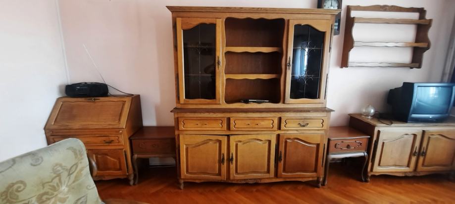 Prodajem rabljeni namještaj:trosjed na razvlačenje 100 eura,vitrina 80 eura,stol I dvije fotelje 70 eura,komoda 30 eura ,tabure 10 eura, zidne polica 10 eura. Komplet 300 eura.Upitati na 099 5162181