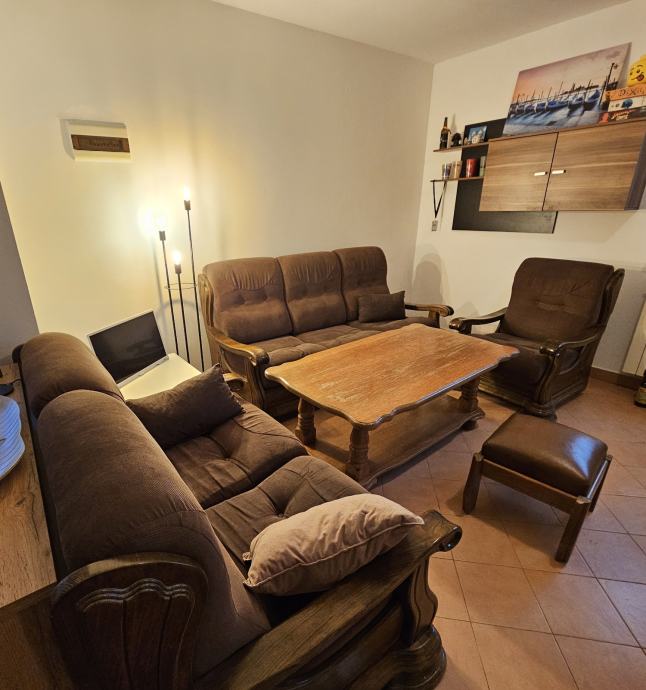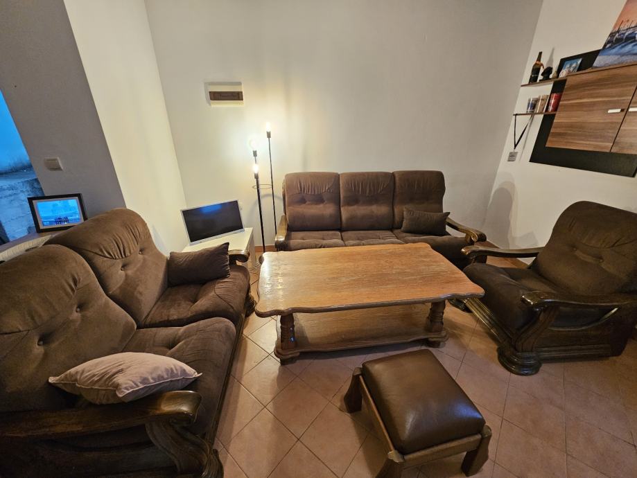Prodajem trosjed (na razvlačenje), dvosjed, fotelju i tabure od masivnog drva. Sve je ukljuceno u cijenu.