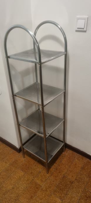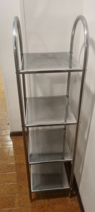 Samostojeće police (4 police), srebrne boje, metal, očuvane, dimenzija police je 32x29cm, visina polica 105cm ( do zadnje police(, a visine s ukrasnim lukom 127cm.