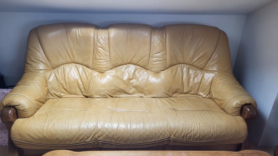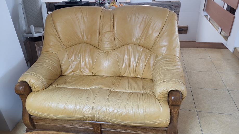 Prodajem uščuvano,kvalitetno i od prave kože. Koristi se dugi niz godina ali je skoro kao novo. Garnitura se sastoji od trosjeda i dvosjeda. Trosjed ima krevet sa pripadajućim madracom na razvlačenje. Od prave kože i hrastovog drva, nepoderivo. Prodaja isključivo zato jer nam više ne koristi u tom obujmu pa zauzima mjesto. Ukoliko želite, uz to ide i hrastov stolić, on je malo poflekan pa ga ne prodajem nego po potrebi poklonim u kompletu. Stolić je original uz garnituru. Molila bi za sve upite javiti se na broj telefona u oglasu. Hvala