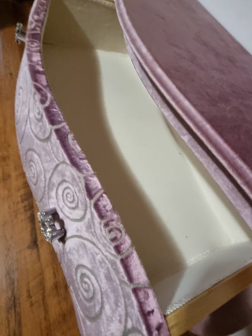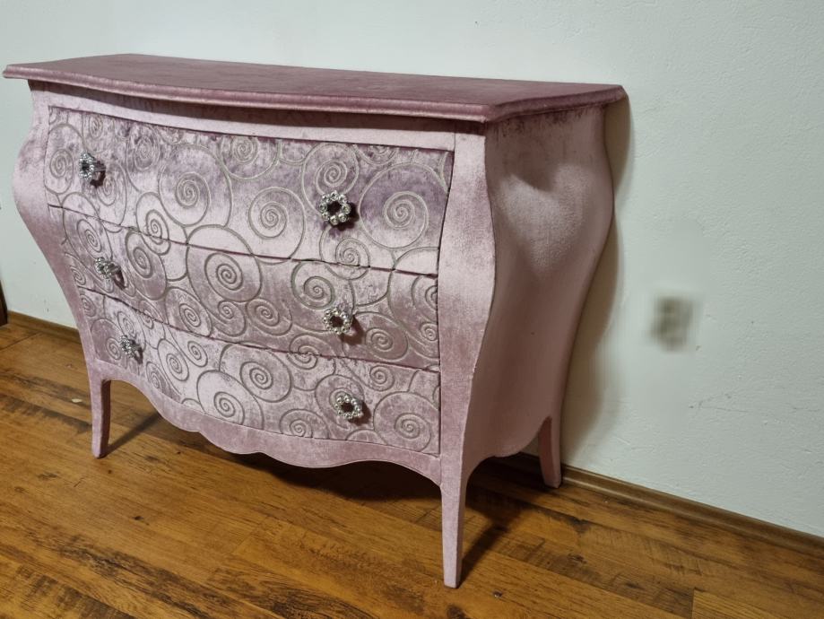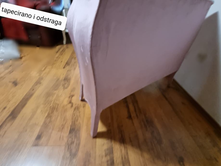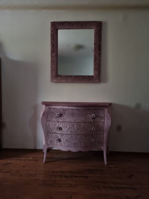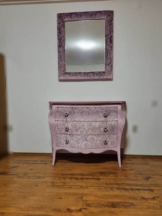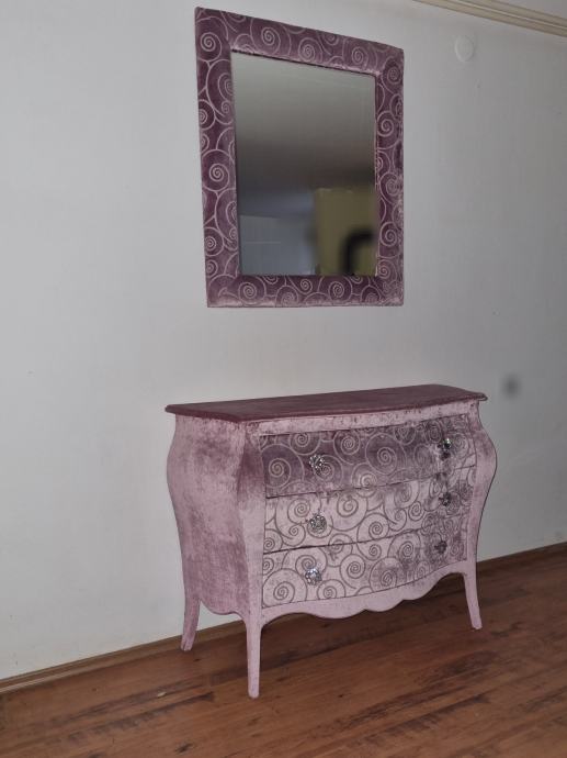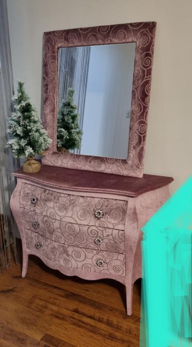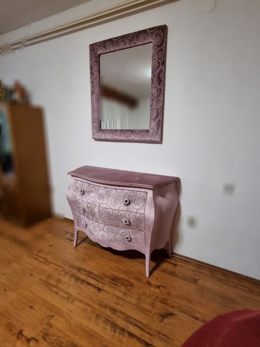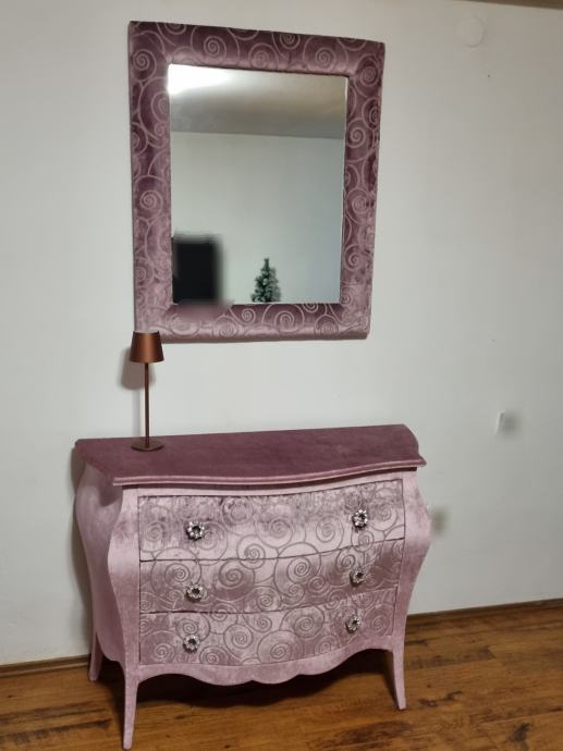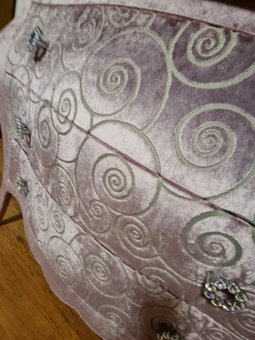 Prodaje se komoda sa slike..drvena je i sva tapecirana u tkaninu/top klase tkanina/...tkanina je tako pedantno tapecirana na način da si odgovaraju i prijelazi dezena sa ladice na ladicu..komoda je tapecirana čak i sa stražnje strane iz iste ton karte koja je i sa prednje strane ...komoda ima 3 ladice koje su predivno tapecirane i IZNUTRA...na ladicama su original Swarowski ruckice (mogu se skinuti..pa staviti neke druge) ..uz komodu ide ogledalo koje je u istom stilu...talijanskog dizajna.Unikat .Teško u današnje vrijeme i naći nekog tko bi to išao raditi tako da još više taj komad dobiva na vrijednosti.Lijepa ko u onim sapunicama iz televizije.