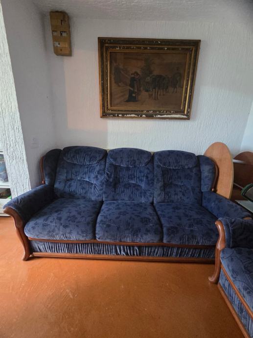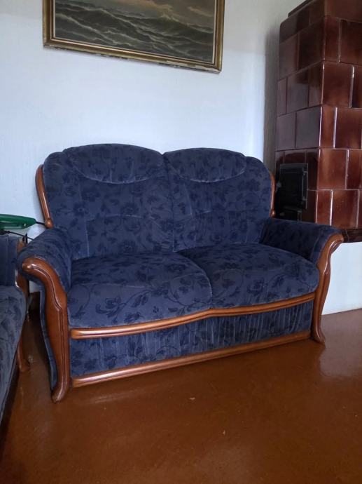 Prodajem masivnu garnituru koja se sastoji od trosjeda i dvosjeda s drvenim okvirima i plavim tapecirungom s uzorkom.