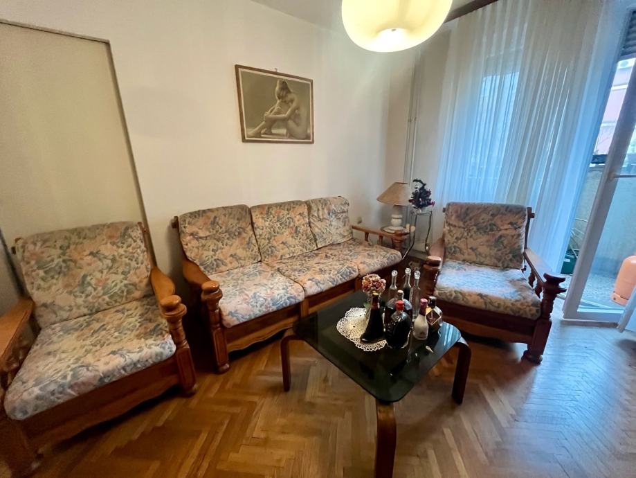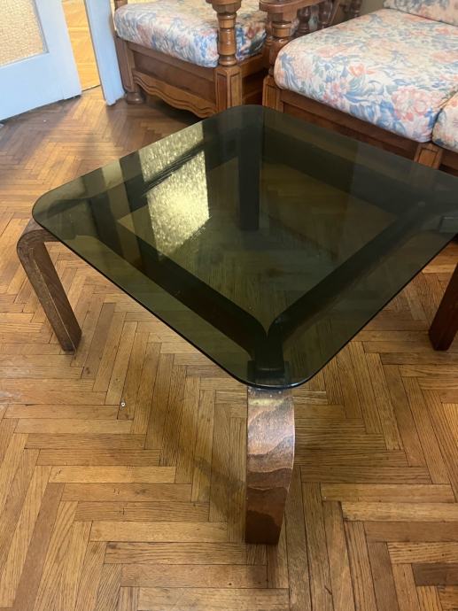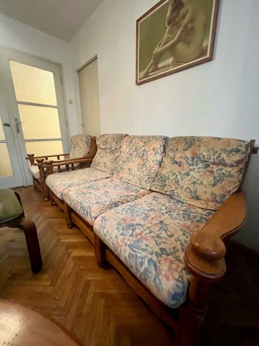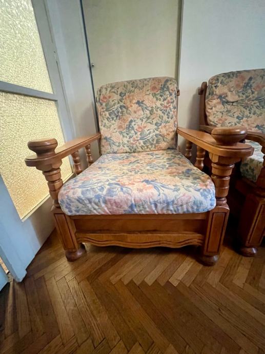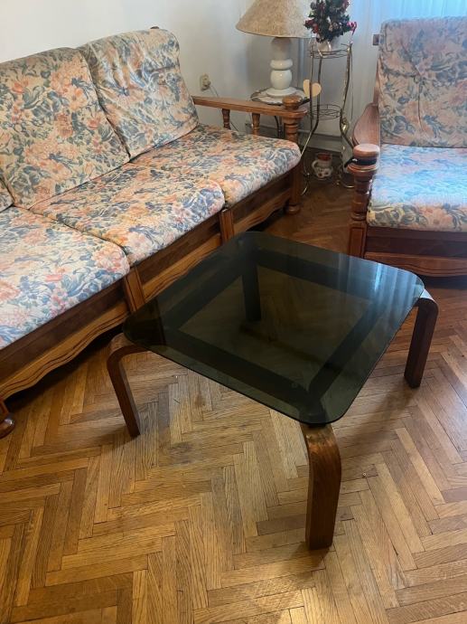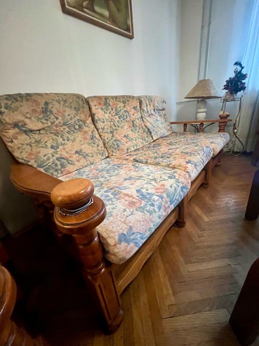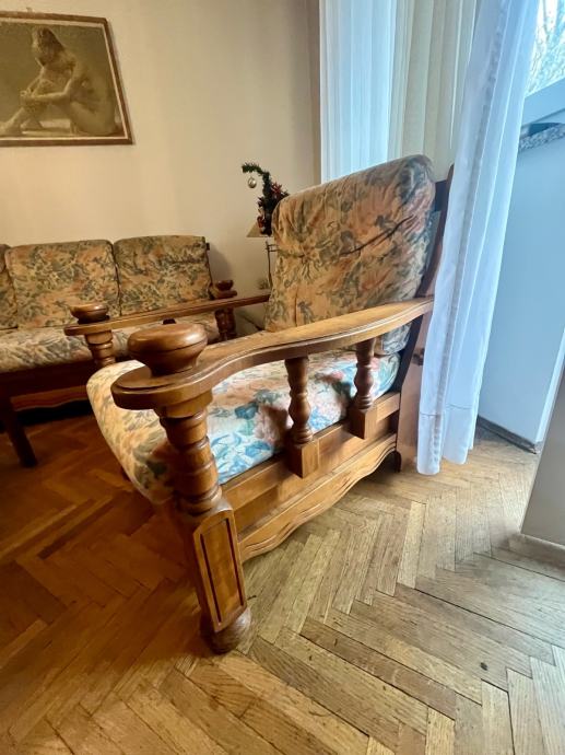 Trosjed, fotelje i stolić za boravak od punog drva. Stol 60x60x40, trosjed na razvljačenje 188x85, fotelje 75x85.