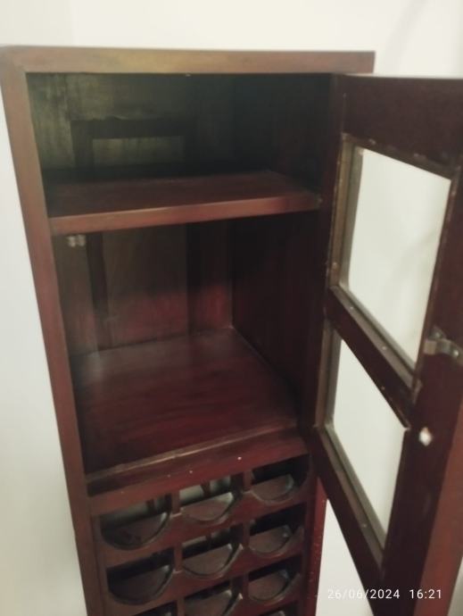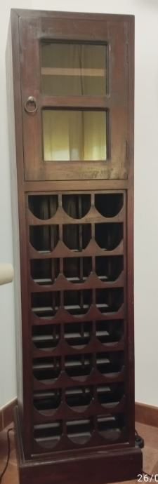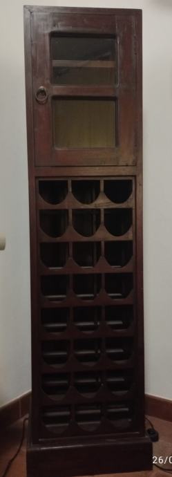 Vinski stalak s funkcionalnim prozorčićem i policom. Puno drvo tamnije boje.