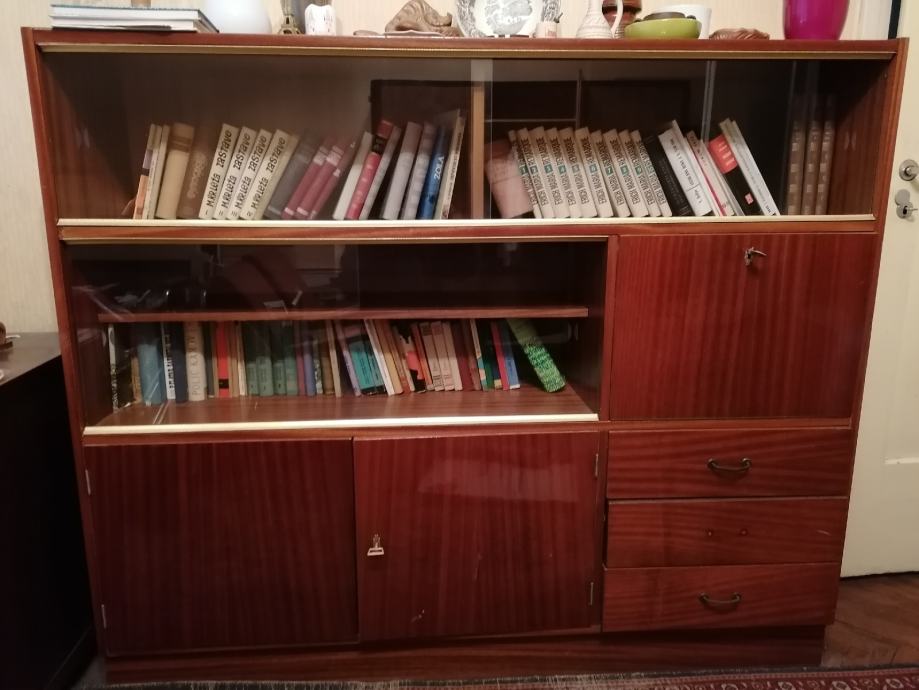 Ispod gornje vitrine je manja (Š105cm, V40cm) dok je zatvoreni dio (vratima) pogodan za sve ostalo. Iznad 3 ladice (V15cm) je dodatni prostor za knjige V40cm, moguća i kao buffet.