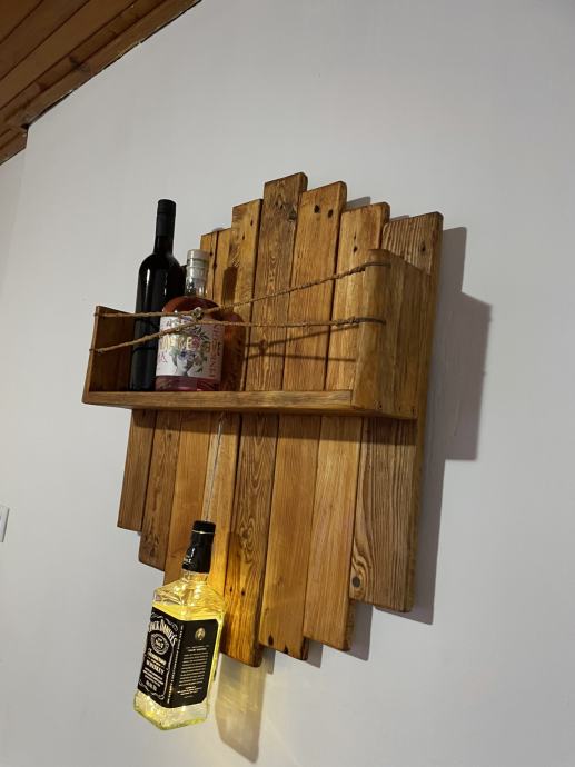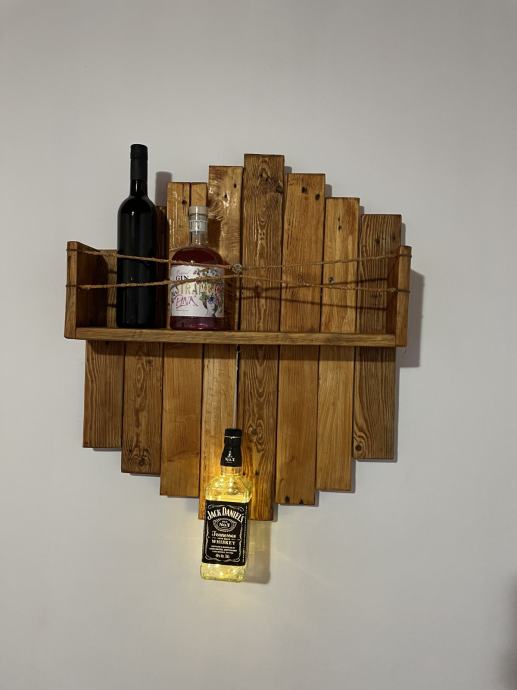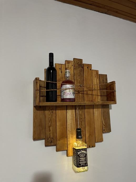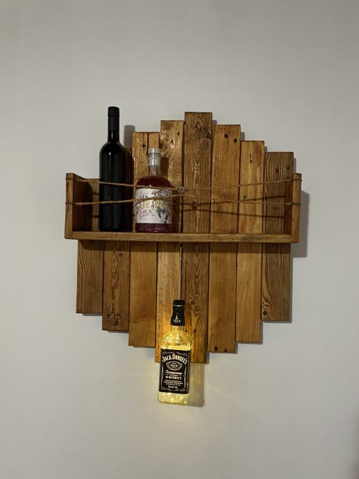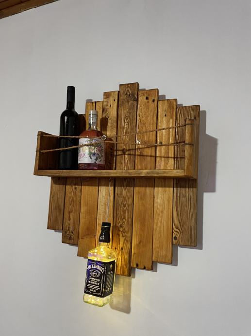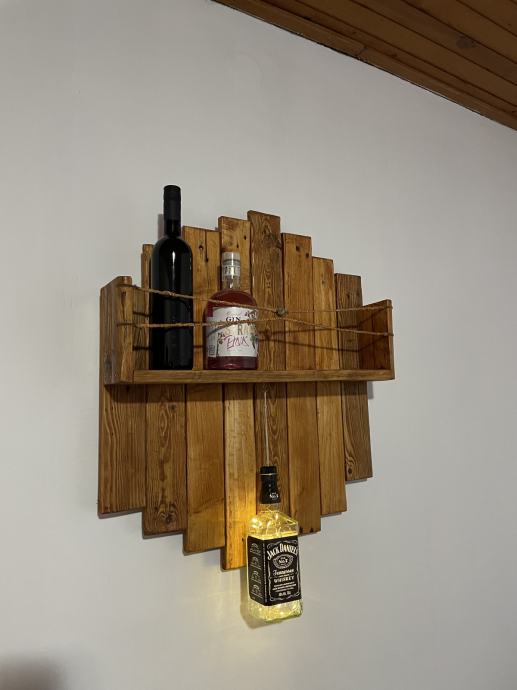 Prodajem ručno rađenu policu za boce pića od punog drveta. Kao dekoracija je stavljena boca Jack Danielsa koja ima ledice u sebi (napaja se aa baterijama tako da nema kablova). Odlična za ukrašavanje monotonih zidova. Cijena 70e.