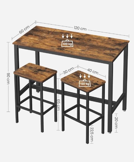 Karakteristike: bistro stol ima ukupne dimenzije 120 x 60 x 90 cm, svaki tabure ima dimenzije 41 x 31 x 65 cm i stoga je savršen za uske prostore.