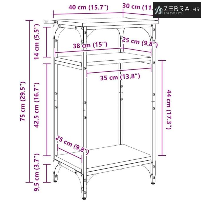 Materijali: Ovo stol ponosi suvremenom površinom od konstruiranog drveta, koja je otporna na mrlje i lako se održava. Čelični okvir i noge dodaju čvrstoću i izdržljivost, podupirući težinu svih stvari koje trebate. Ova kombinacija jamči trajnost i industrijski look koji unapređuje vaš prostor. Uključeni dijelovi: S policama od daske koje optimiziraju prostor, ovaj komad nudi funkcionalan sustav. Njegove police od konstruiranog drveta služe kao praktično rješenje za organiziranje knjiga ili prikazivanje dekoracija, poboljšavajući korisnost stola. Podesive karakteristike: Stol ima podesive noge koje osiguravaju stabilnost na neravnim površinama, čineći ga još praktičnijim. Ova značajka dodatno poboljšava korištenje, omogućujući vam da ga koristite u raznim okruženjima, bez brige o stabilnosti. Preporučena uporaba: Super je za unutarnju upotrebu, služi kao krajnji stol ili privlačni akcentni komad u minimalističkim prostorima. Njegova čvrsta izrada čini ga privlačnim komadom, omogućujući vam da eksperimentirate s rasporedom i stilom vašeg prostora. Njega i održavanje: Održavanje stola je jednostavno. Samo ga obrišite suhom krpom za ugodan izgled. Redovito održavanje čuva njegov sjaj i uredan izgled, pridonoseći ugodnoj atmosferi doma. Boja: Crni hrast