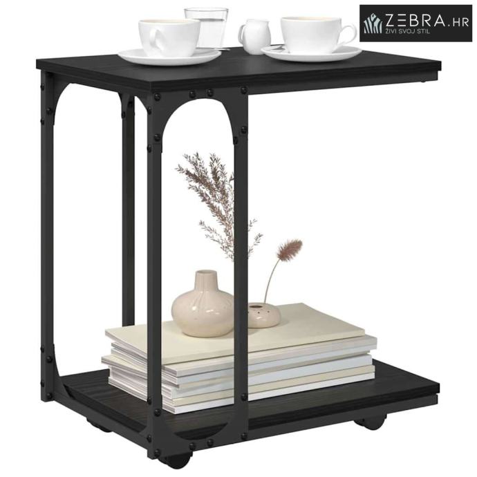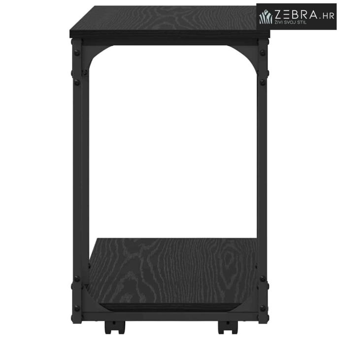 Sastav materijala: Stolić ima čvrstu površinu od konstruiranog drva i okvir od obloženog metala. Ova kombinacija osigurava stabilnost i dugotrajnost, s mat završetkom koji savršeno pristaje rustikalnim prostorima. Materijali visoke kvalitete garantiraju otpornost na svakodnevno trošenje, držeći sofisticirani izgled godinama. Integrirani skladišni elementi: Opremljen policama od daske, ovaj stolić nudi funkcionalnu pohranu, smanjujući nered. Ove police su idealne za knige, časopise ili dekoracije, spajajući praktičnost i stil za bolji izgled vašeg prostora. Izdržljiv okvir: Čvrst metalni okvir podržava stolić, jamčeći stabilnost i izdržljivost. Prahovo lakiranje ne samo da ga čini otpornim, nego i estetski ugodnim uz površinu od konstruiranog drva. Ova pametna konstrukcija nudi rješenje za svakodnevnu upotrebu u udobnim i dinamičnim domovima. Višenamjenski dizajn: Stolić se ističe svojim C-oblikom s kotačima, prilagođenim za više namjena. Savršen je za držanje pića pored sjedećeg mjesta, ili kao susjedni 'prijatelj'u dnevnoj sobi, osiguravajući fleksibilnost i brz pristup. Upute za njegu: Da bi stolić ostao u dobrom stanju, jednostavno ga obrišite vlažnom krpom. Izbjegavajte jake kemikalije ili abrazive kako biste očuvali završnu obradu i osigurali da komad ostane elegantan dodatak prostoru. Boja: Crni hrast