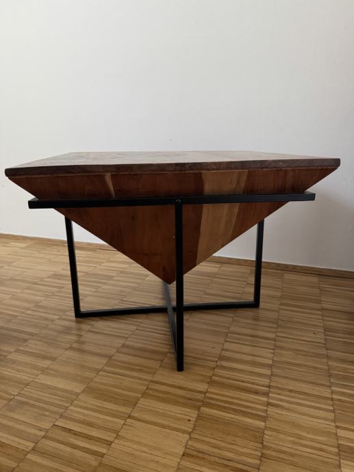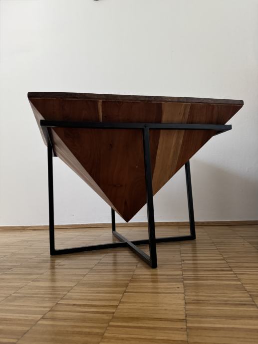 Prodajem moderan, ručno izrađen stolić od masivnog akacijinog drva s konstrukcijom od crnog metala. Gornji dio stola oblikovan je kao obrnuta piramida, što mu daje jedinstven geometrijski i skulpturalni izgled – savršen za ljubitelje dizajna i interijera s karakterom.