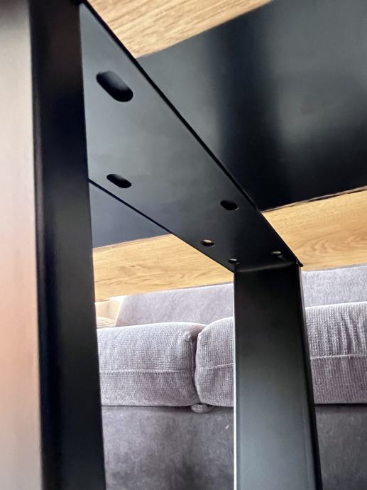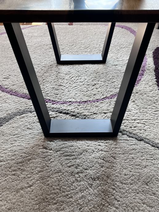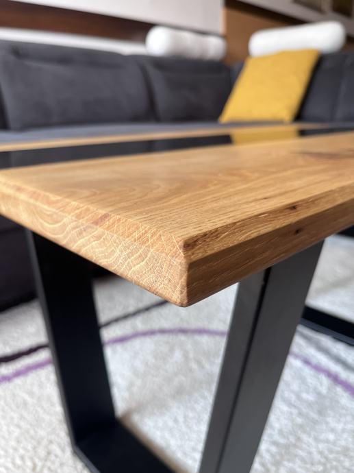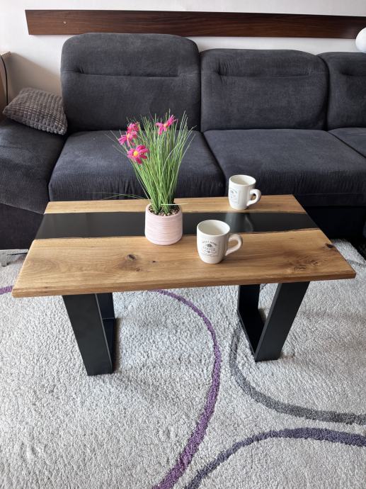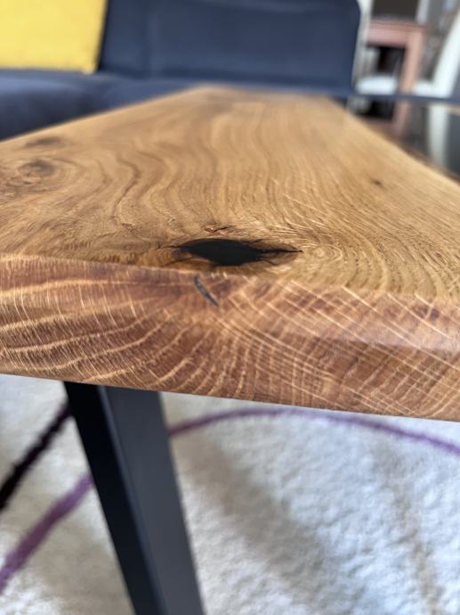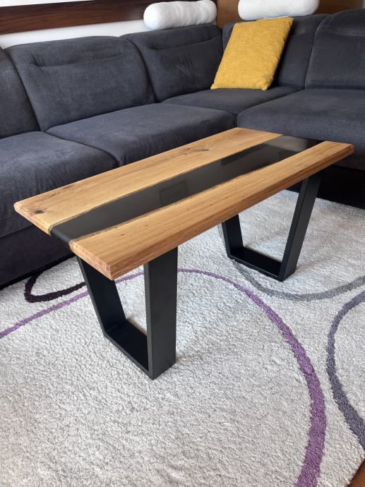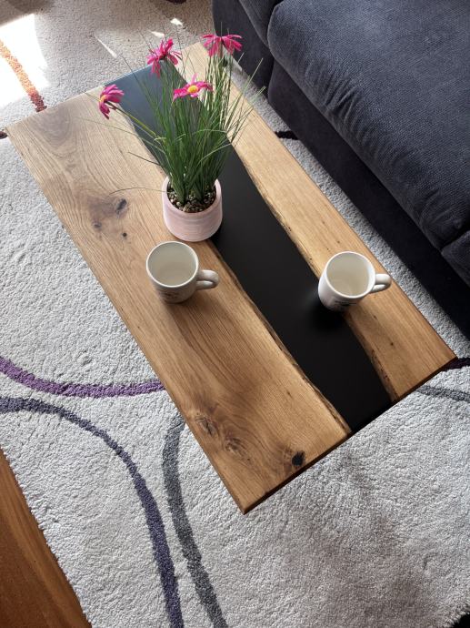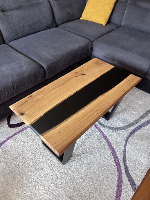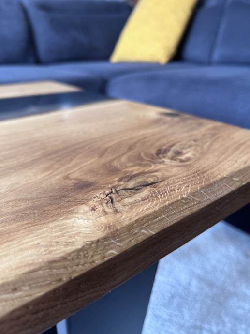 Riječni stol sa punim drvetom hrasta i crnom epoxi smolom. S prirodnim pukotinama i nepravilnostima koje dodatno naglašavaju teksturu i bogatu boju hrasta, bez da narušavaju njegovu autentičnu ljepotu. Opremljen je nogicama u V obliku koje savršeno odgovaraju njegovim dimenzijama i dodatno naglašavaju njegov moderan izgled.