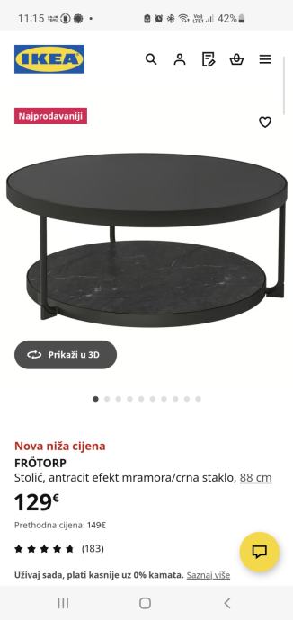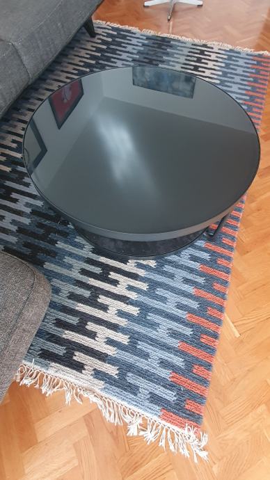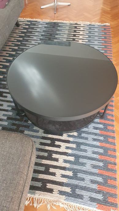 Ikea stolić Frotorp, staklo, metal, drvo, okrugli, promjer 88 cm, visina 35 cm, gornja ploča tamno neprozirno staklo, donja ploča drvo imitacija mramora.