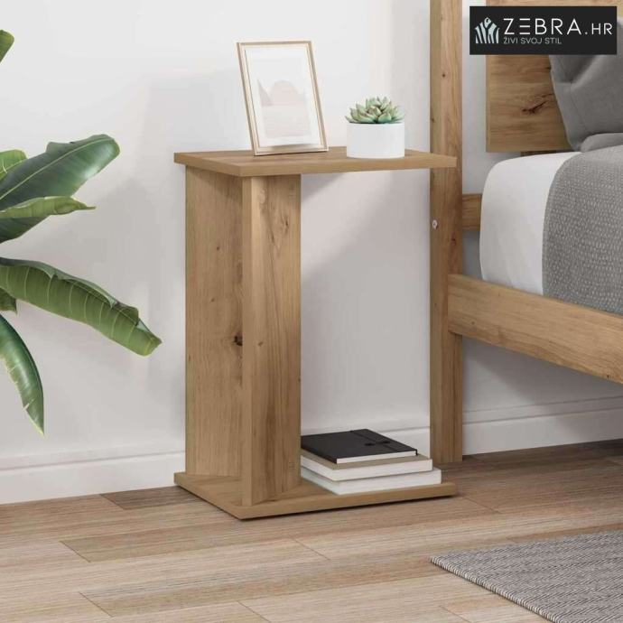 Ovaj moderni stolić za kraj sjajno kombinira funkcionalnost i suvremeni stil, savršeno se uklapa u svaki dnevni boravak. Izrađen je od konstruiranog drva, pravokutnog je oblika s čestim linijama, što ga čini elegantnim obogaćenjem vašeg doma. Savršen je za one koji vole jednostavnost, nudi moderan i suptilan izgled i pruža praktična rješenja za organizaciju, tako da je prostor uvijek uredan. Njegova svestranost omogućava da se koristi kao mjesto za lampu uz kauč ili da se izlažu dekorativni komadi koji poboljšavaju estetsku privlačnost sobe.