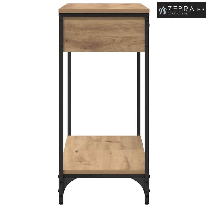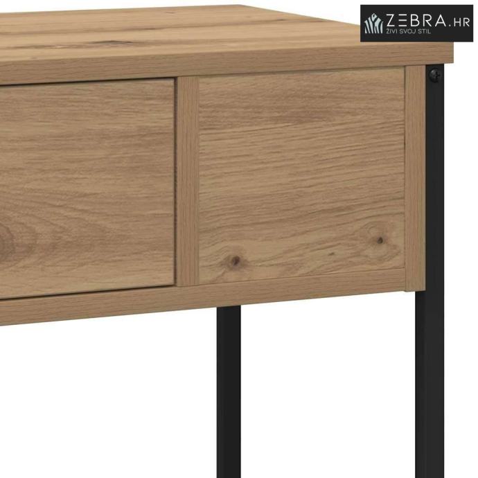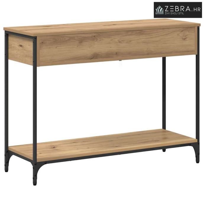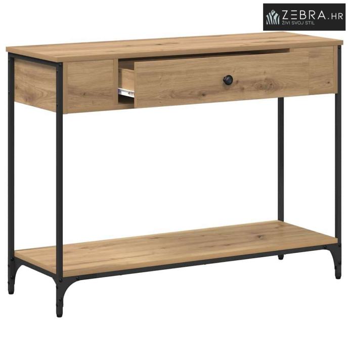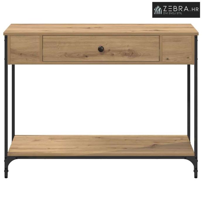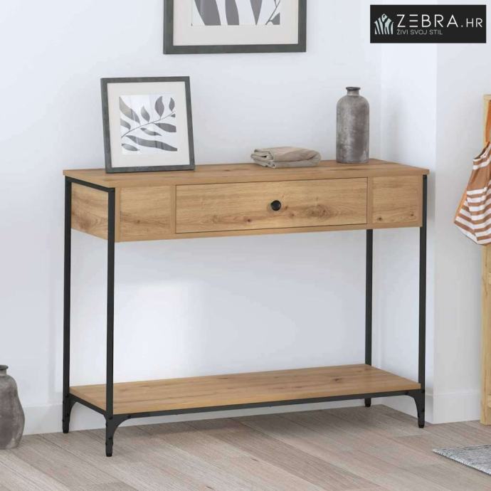 Materijali: Ovaj konzolni stol je od inženjerskog drva, što mu daje čvrstoću i siguran osjećaj. Drvena površina ima lijep prirodan izgled koji se super uklapa u rustikalni dekor, donoseći prirodu u tvoj dom. Uključeni dijelovi: S prostranim policama, ovaj stol nudi puno prostora za knjige, dekoracije ili osnovne stvari. Klasične ladice s dugmadi pružaju dodatnu skrivenu pohranu kako bi sve bilo uredno. Karakteristike / Funkcija / Dizajn: Dizajn stola je fokusiran na funkcionalnost, nudeći prostor za dekor i svakodnevne stvari. Kombinacija inženjerskog drva i metala čini ga stiliziranim i čvrstim. Preporučena upotreba: Savršeno za hodnike da uhvate ključeve ili poštu, u dnevnim sobama kao istaknuti komad, ili za isticanje dekoracija, ovaj konzolni stol se lako uklapa bilo gdje. Njegov rustikalan izgled dobro se slaže s tradicionalnim i modernim stilovima. Održavanje: Održi ga u dobrom stanju izbjegavanjem jakih kemikalija; meka krpa je sve što ti treba za čišćenje. I kao sigurnosni savjet, učvrsti sav viši namještaj za zid, posebno u prometnim stanovima. Boja: Hrast artisan