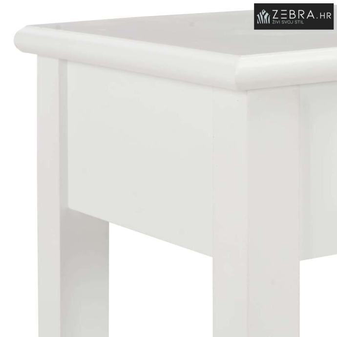 Stol ima čvrstu ploču od MDF-a, na koju možete postaviti ukrasne predmete poput košara s voćem ili vaza. Noge od masivnog borovog drva jamče njegovu stabilnost i izdržljivost, osiguravajući dugi vijek trajanja. Uz to, 3 ladice pružaju dovoljno prostora za čuvanje svakakvih manjih predmeta organiziranima i na dohvat ruke. Polica nudi dodatno mjesto za pohranu vaših cipela i drugih stvari.