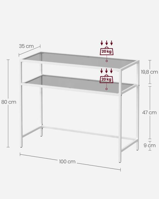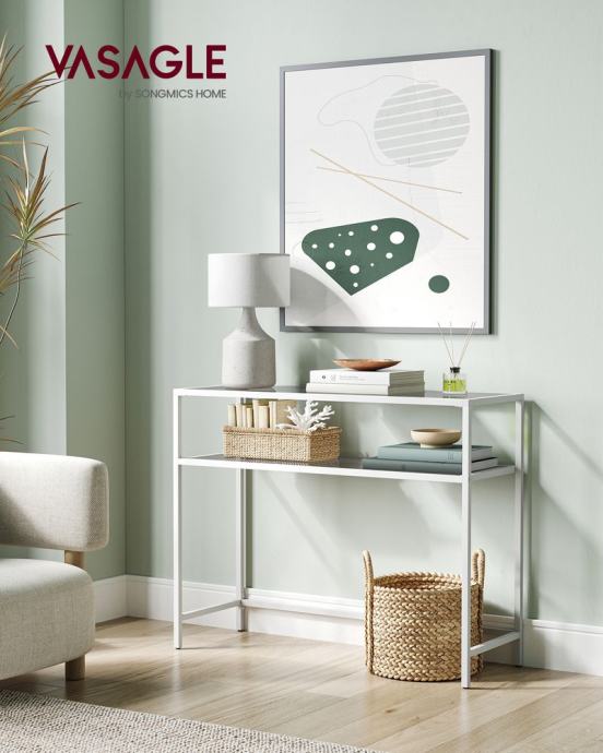 Fascinantan minimalizam: podižite svoj dom na potpuno novu razinu s ovim modernim konzolnim stolom. Zlatni metalni okvir i police od kaljenog stakla čine minimalistički i praktičan vrhunac namještaja.