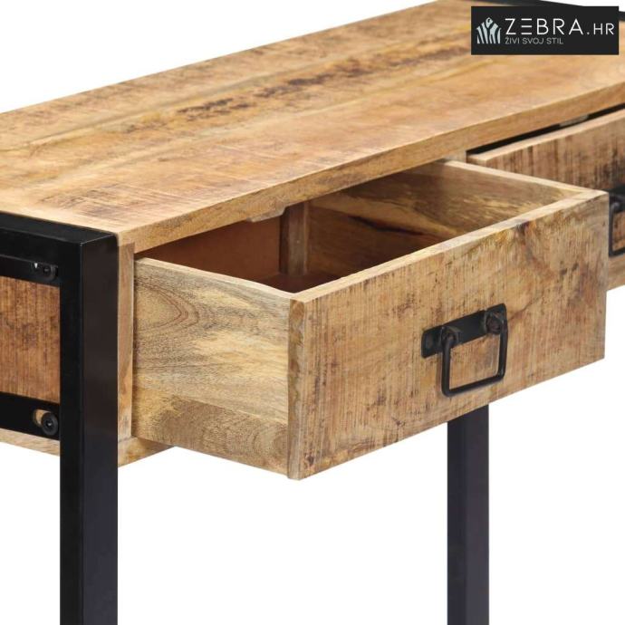 Ovaj stol napravljen je od masivnog drva manga, tvrdog drva s gustim godovima. Grubo drvo manga s jedne se strane odlikuje snagom da izdrži težinu, a s druge strane podnosi trošenje s vremenom. Zbog toga je ovaj lijepo dizajniran stol za hodnik izuzetno stabilan, izdržljiv i privlačan. Izvrsna izrada i prekrasni drveni godovi čine svaki komad namještaja jedinstvenim i pomalo drukčijim od sljedećeg. Uz to, ovaj stol opremljen dvjema ladicama pruža dovoljno prostora za pohranu vaših osobnih stvari i održavat će vašu sobu urednom.