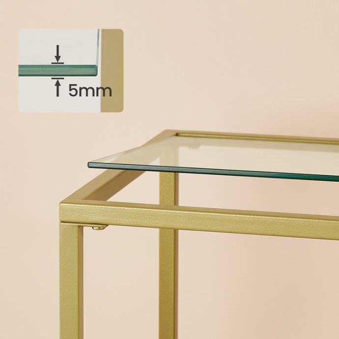Okvir zlatne boje i šik kaljeno staklo stvaraju luksuzan i praktičan stol za hodnik. Asimetrične police ne samo da vam nude obilje prostora, već služe i kao ukras koji će vašoj sobi dodati otmjenost. Robusni čelični okvir i visokokvalitetno kaljeno staklo (debljina: 5 mm) jamče visoku stabilnost i otpornost (nosivost do 30 kg); isporučena zaštita od prevrtanja nudi dodatnu stabilnost. Ovaj stol veličine 35 x 100 x 80 cm stane u različite prostorije - u radnu sobu za knjige, u dnevnu sobu za ukrasne predmete ili u hodnik za ključeve i druge sitnice. Predsobni stol od 16 kg s otvorenim policama za odlaganje, zaštitom od prevrtanja za sigurnije okruženje i podesivim nogama koje pružaju stabilnost čak i na neravnim podovima i štite vaš pod od ogrebotina. Za sve informacije nazovite na broj telefona 092/399-75-19