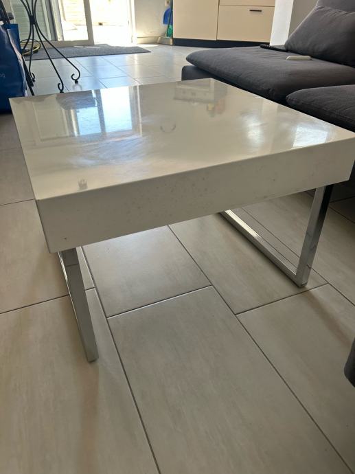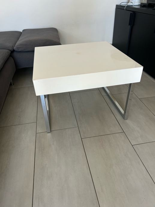 Prodajem moderni stolić u odličnom stanju. Gornja ploha je visokog sjaja, a noge su čvrste i elegantne, metalne (kromirani izgled). Minimalistički dizajn savršen za dnevni boravak, ured ili čekaonicu.