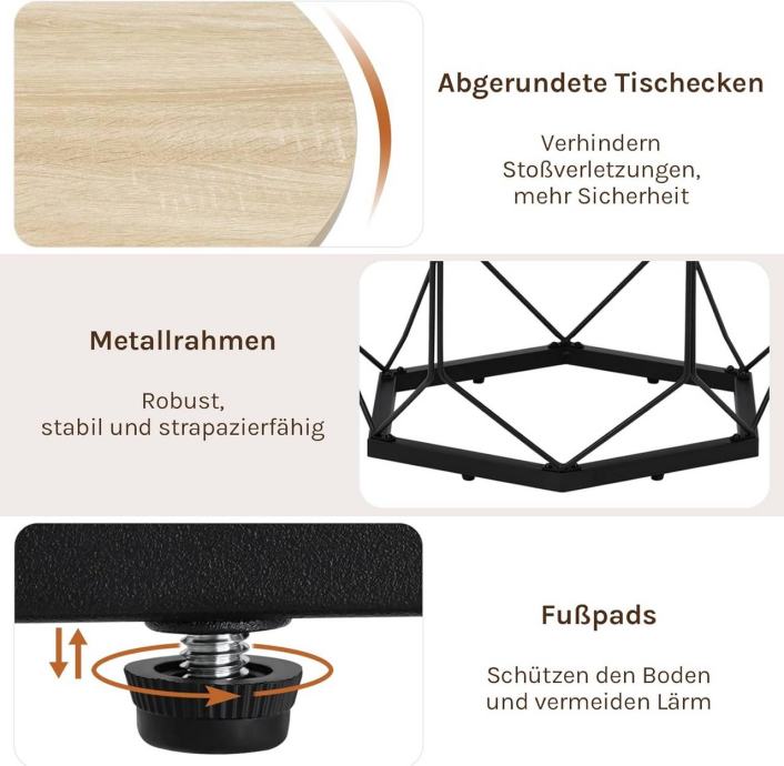 Ploča stolića izrađena je od MDF-a (E1 razred) s melaminskim slojem, otporna je na vodu i jednostavna za čišćenje. Metalna baza otvorenog dizajna čvrsto je zavarena, što stoliću osigurava stabilnost i nosivost do 20 kg.