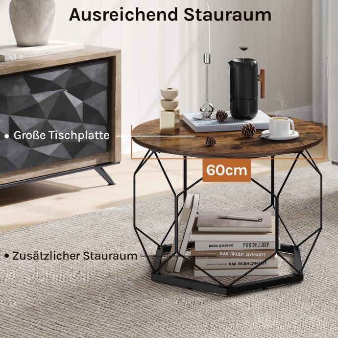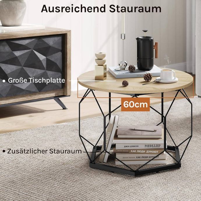 Okrugli stolić za kavu pruža praktičnu površinu promjera 60 cm na kojoj možete postaviti kavu, kolače, vaze s cvijećem, knjige i druge sitnice. Unutrašnji prostor visine 45 cm idealan je za jastuke ili kutije za pohranu. S ovim jednim stolićem možete zadovoljiti i potrebe za opuštanjem i skladištenjem.