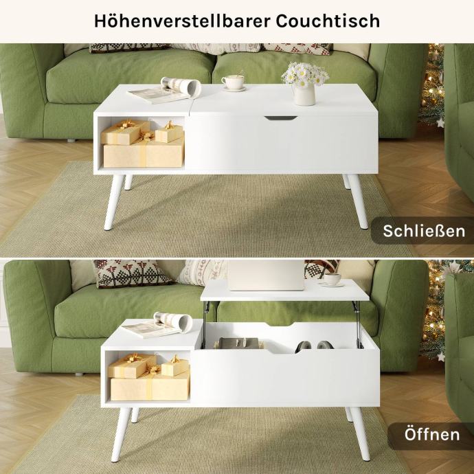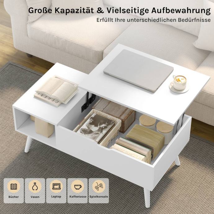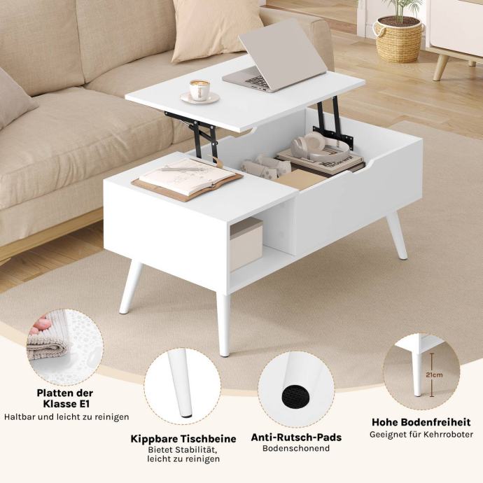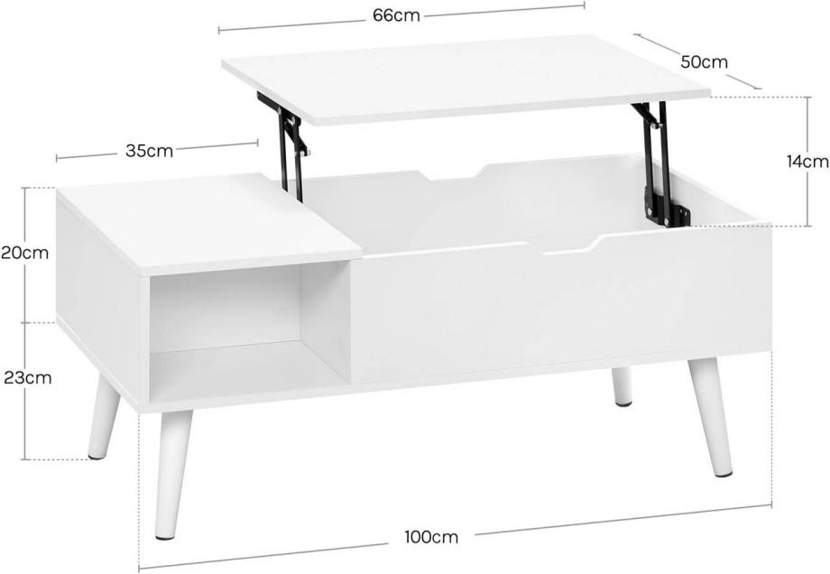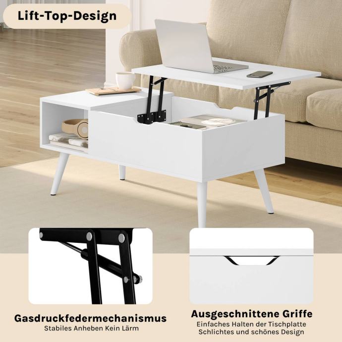 Ovaj stolić za kavu ima podiznu ploču zahvaljujući šupljim ručkama i mehanizmu s plinskim podizačem, što omogućuje jednostavno korištenje kao privremeni radni stol, stol za objedovanje ili klasični stolić za kavu. Kada se ploča spusti, stolić izgleda elegantno i moderno.