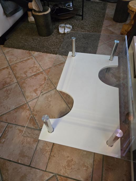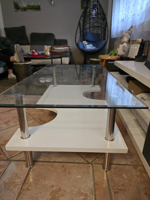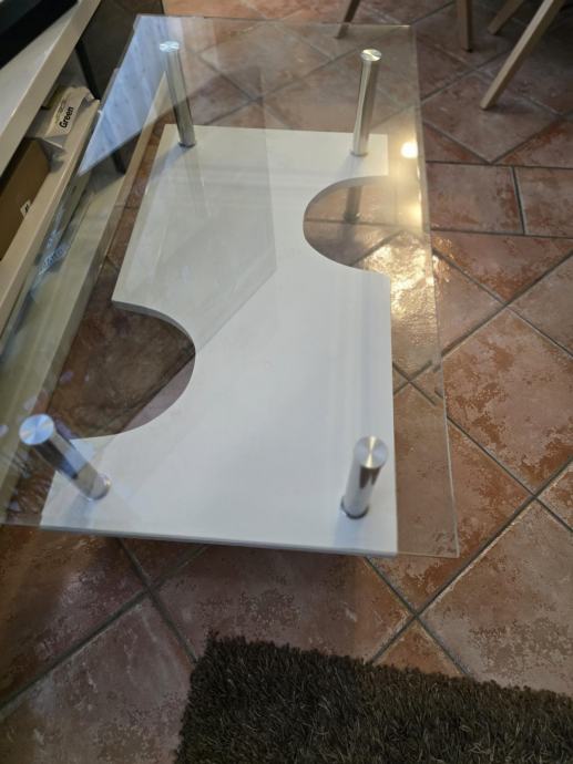 klub stolić dimenzija 110x60 cm , visina 41 cm. Gornja površina od debelog otpornog stakla, donja polica na visini 19 cm.