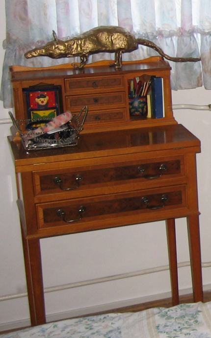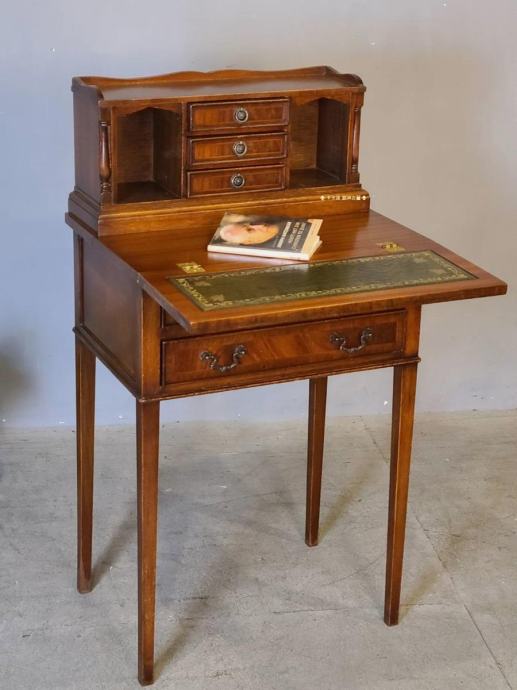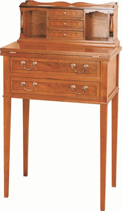Ovaj poseban komad namještaja nudi detalje koje nalazimo kod kvalitetno izrađenih komada namještaja od strane vrhunskih majstora, što je rijetko kod modernog namještaja. To je, dakle, mali pisaći stol od tise, s gornjim dijelom koji ima tri središnje ladice, okružene otvorenim policama. Prednji dio ima preklopni poklopac s umetnutom kožnom površinom za pisanje, a ispod toga dvije ladice. Stol stoji na kvadratnim, sužavajućim nogama. Dimenzije su 99 cm x 54 cm x 39 cm kada nije produžen.
