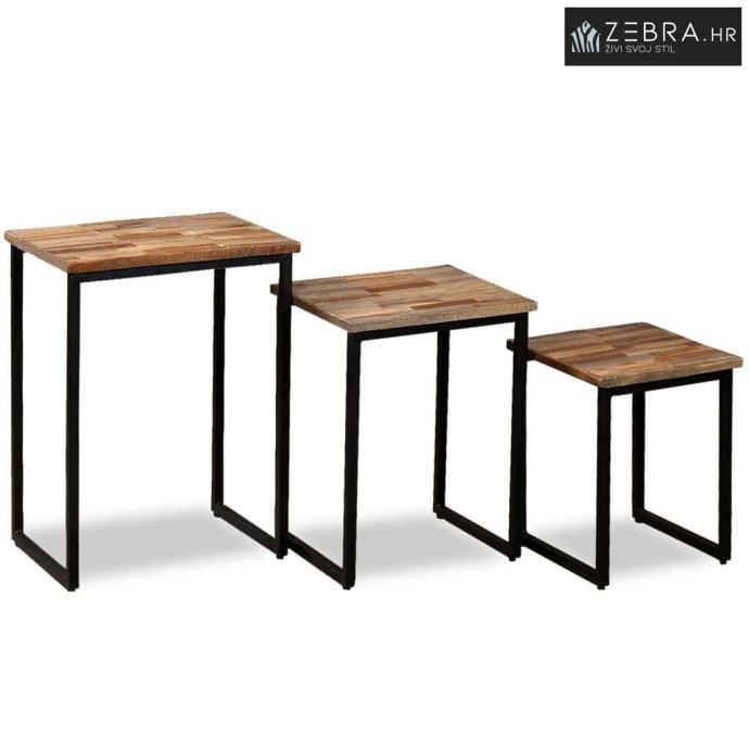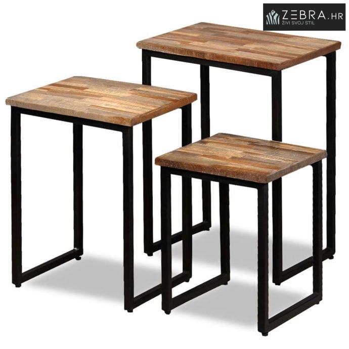Ovaj set uklapajućih stolića za kavu izrađen je od obnovljene tikovine, što znači da je svaki komad namještaja jedinstven i pomalo drukčiji od sljedećeg. Obnovljena je tikovina čvrsta, stabilna, izdržljiva i lijepa. Čvrste čelične noge čine uklapajuće stoliće vrlo čvrstima i izdržljivima te pojačavaju njihov spektakularan industrijski stil.