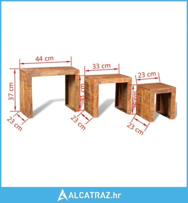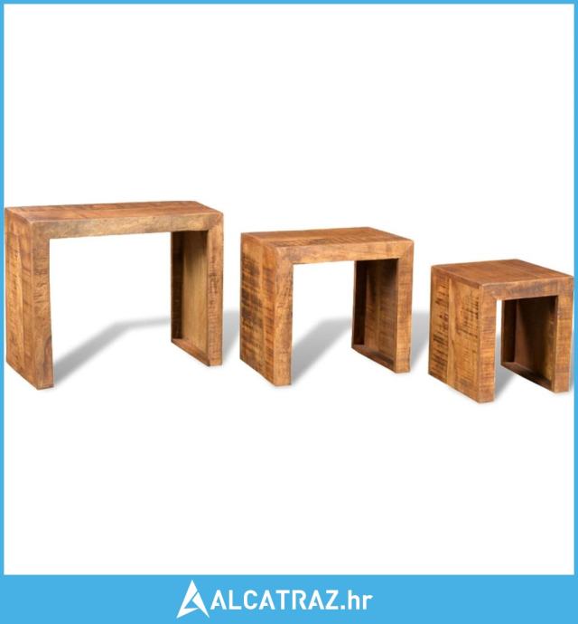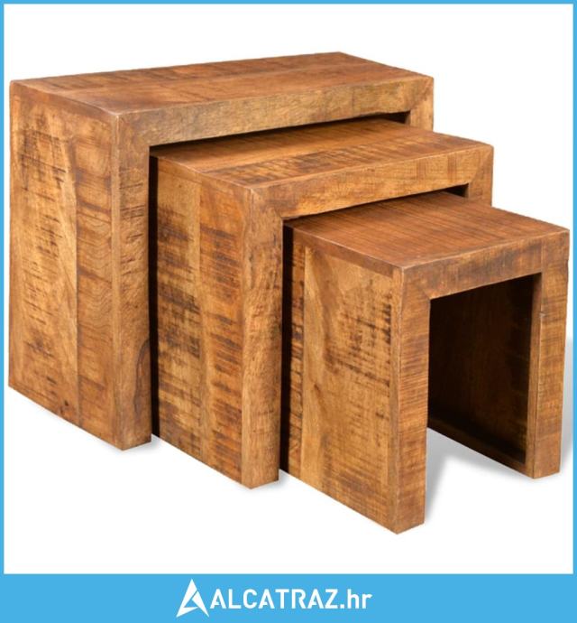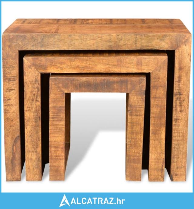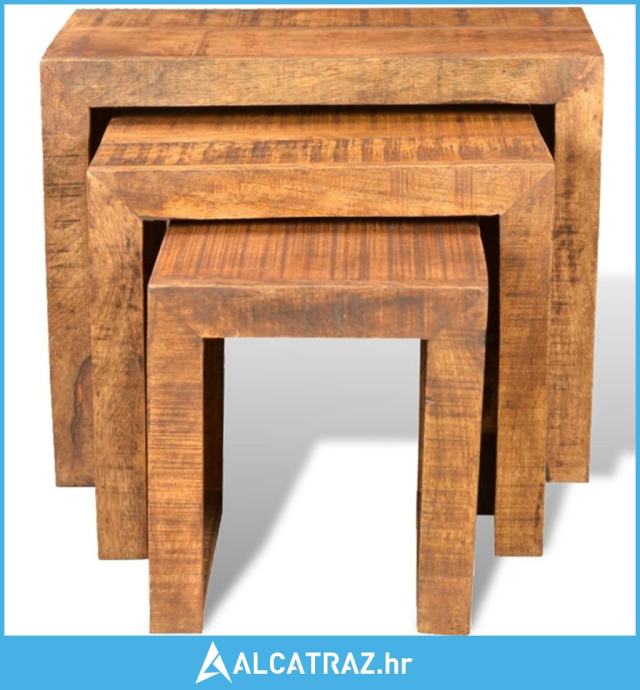 Ovaj set od 3 uklapajuća stolića je izrađen od visokokvalitetnog drva manga, što znači da je svaki primjerak čvrst, stabilan i izdržljiv. Vidljiva struktura godova čini ih unikatnim i pomalo različitim od ostalih.