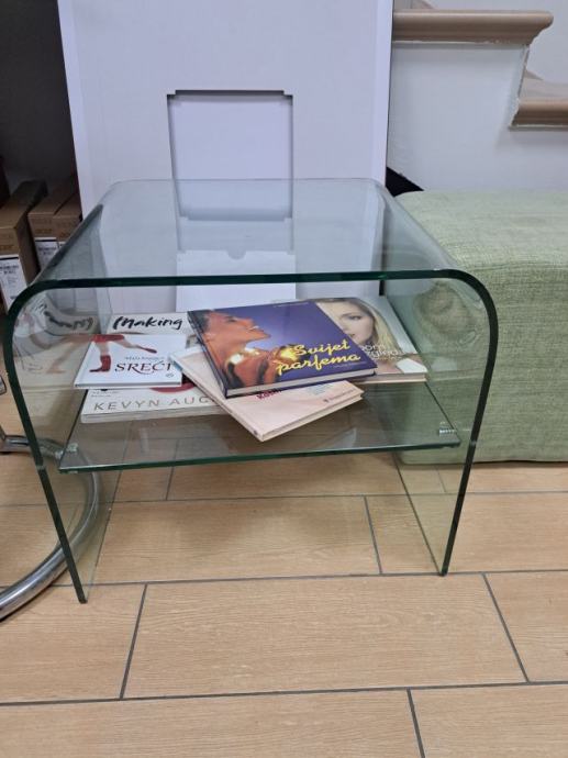 Čvrsti, vrlo atraktivni stakleni stolić (talijanski brend Berloni): zaobljenih rubova: visina 49cm, širina 54cm, dubina 44cm, debljina stakla 1cm