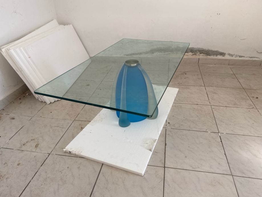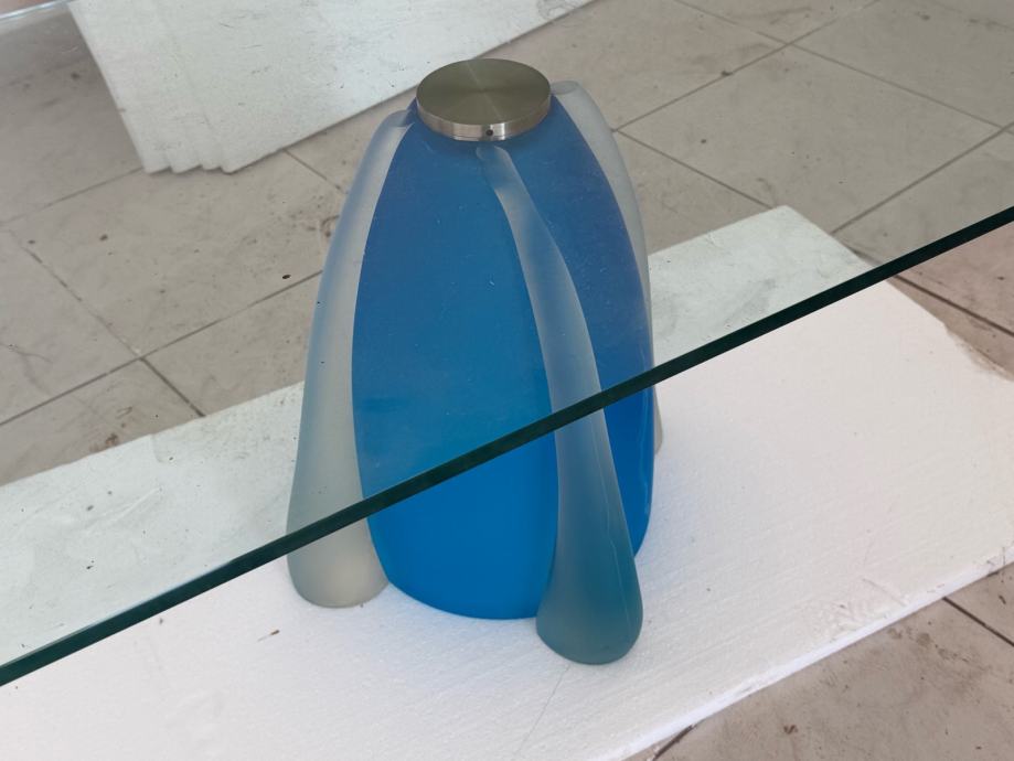 Prodajem stakleni stolić za dnevni boravak, nov. Ploča stola izrađena je od prozirnog kaljenog stakla pravokutnog oblika. Središnji nosač upečatljivog je dizajna – radi se o skulpturalnoj osnovi od matiranog stakla u plavoj i sivoj nijansi s metalnim detaljem na vrhu, što stolu daje poseban i moderan izgled.