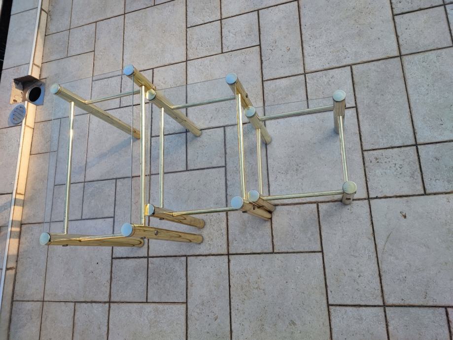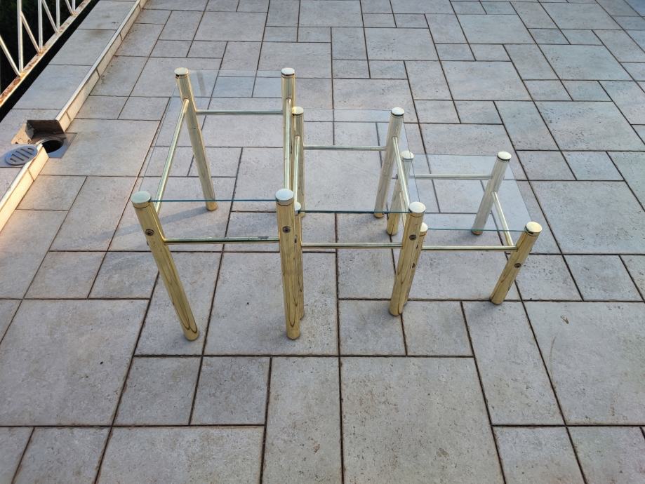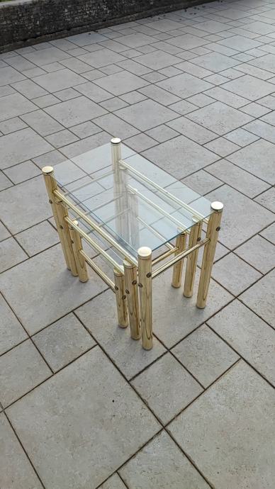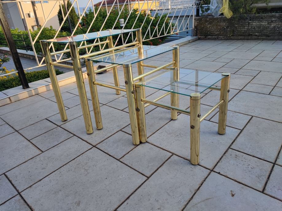 Mogu se složiti jedan ispod drugog. Okvir bi nogice boje mesinga. Promjer nogica 3,2 cm.
