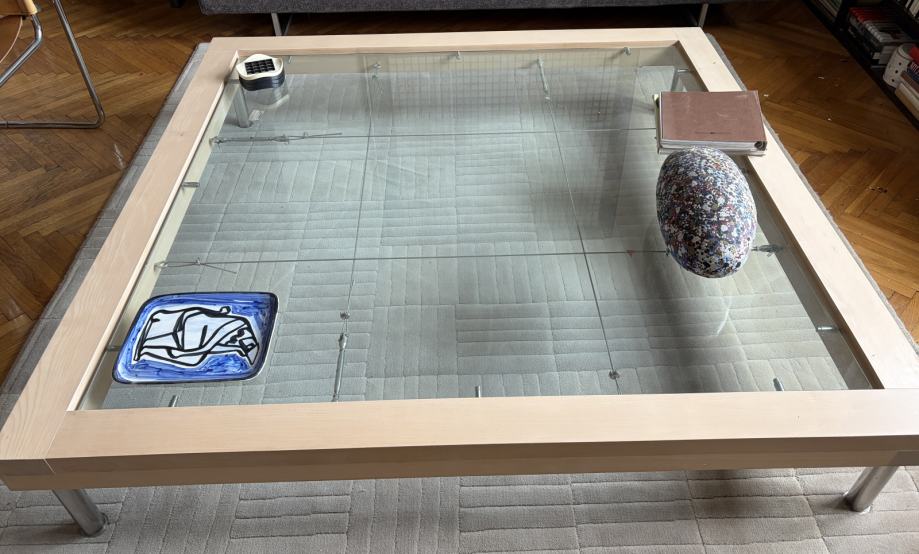 Stol za dnevni boravak 150x150x30, drvo, kaljeno staklo i inoks, rad i dizajn J. Eterović, u besprijekornom stanju prodajem.