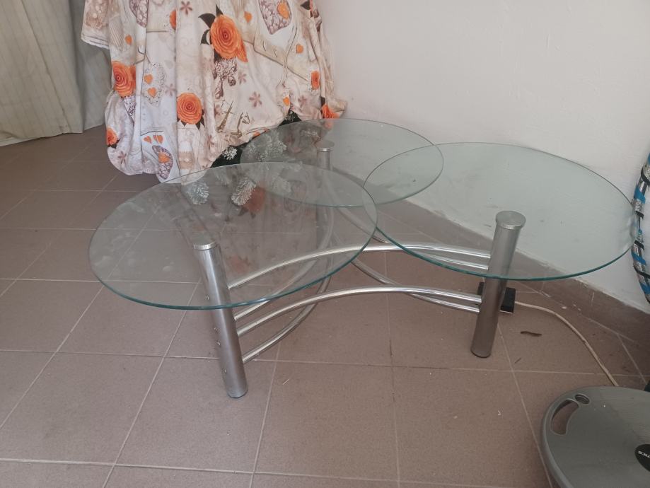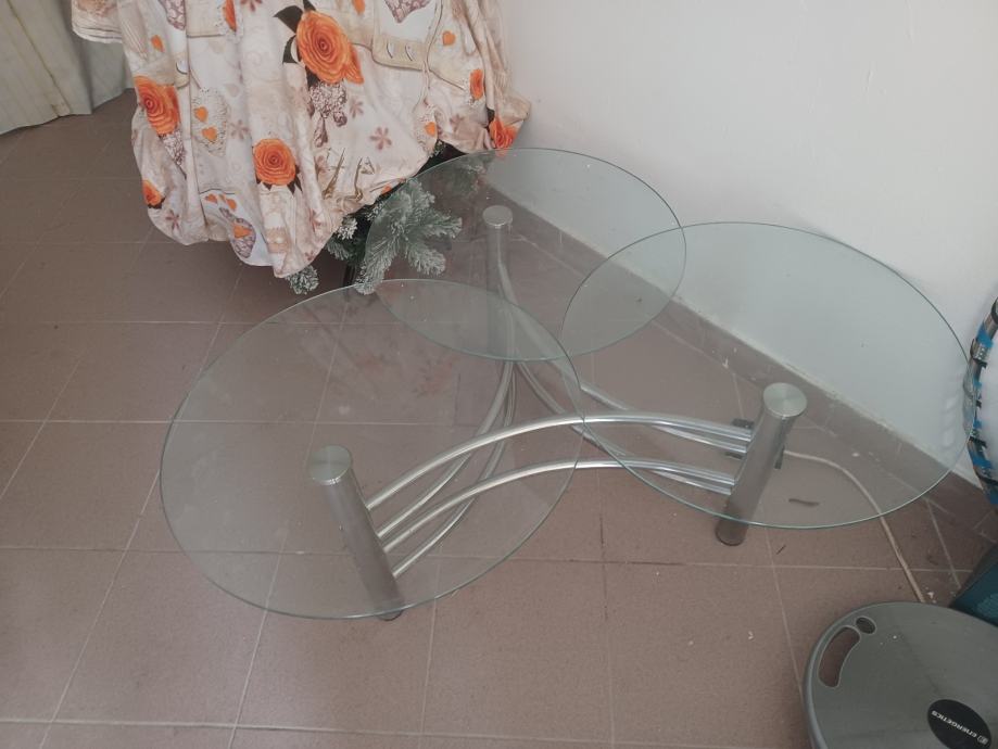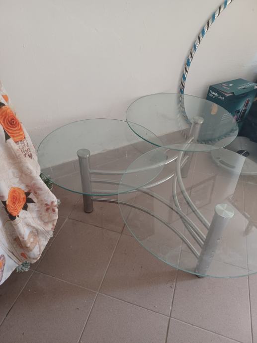 Prilika !Očuvani Stol sa 3 staklene pomične ploče,svaka dia. 60 cm !! Vis. od poda 50 cm. Noge metal kromirane!!