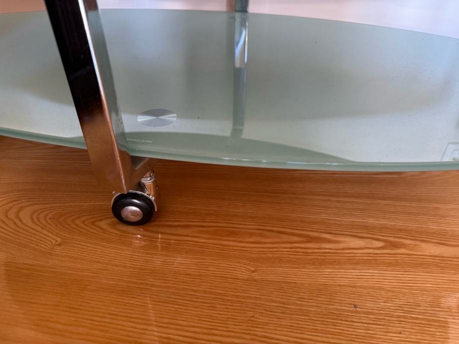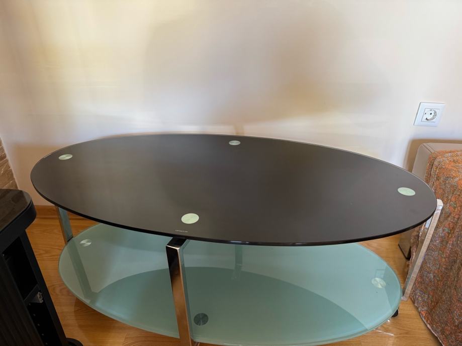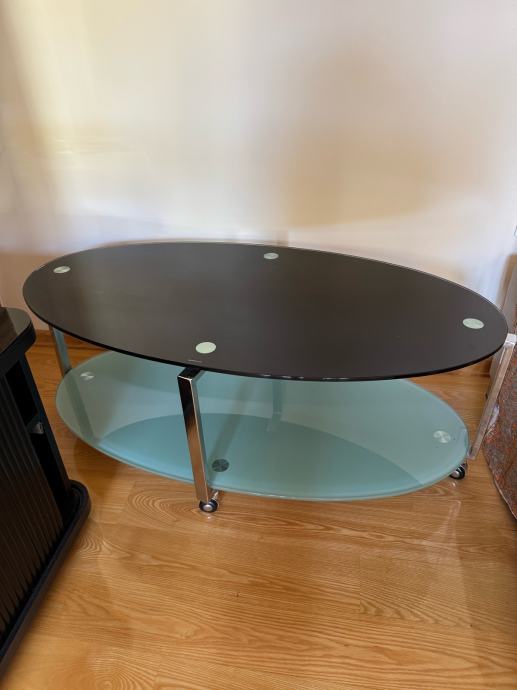 NOV Stakleni ovalni stol sa tockicima. Crno-zelene boje. Obje ploce su od stakla a drzaci metalni. Ne koristen. 55 Eura. Duzina 105 x sirina 55 x visina 42 cm.