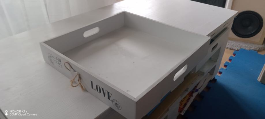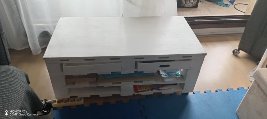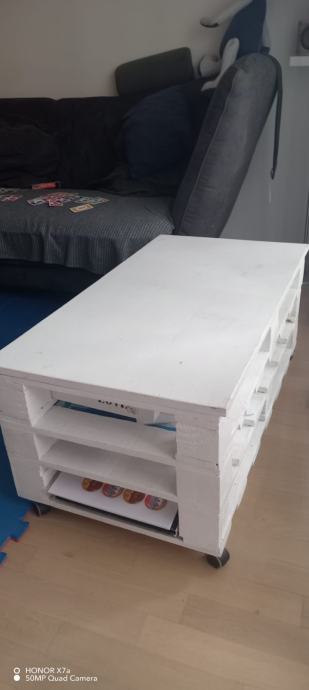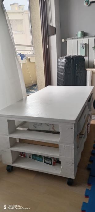 Prodajem stol od paleta za dnevni boravak. Stol je ručni rad i prefarban u bijelu boju, ima montirane kotačiće. U dobrom stanju, bez oštećenja ili truleži drva. Uz stol se dobiju i dvije ladice koje se mogu umetnuti ispod stola.