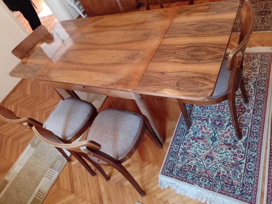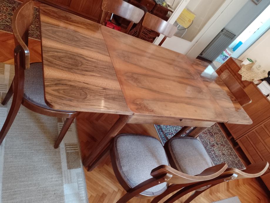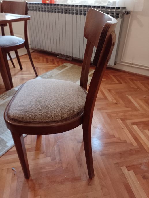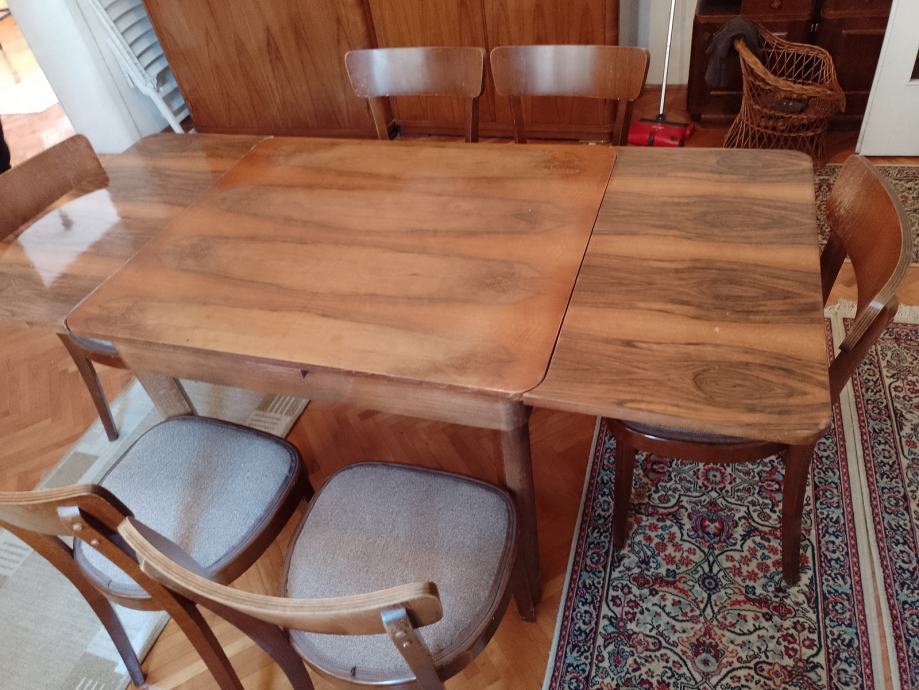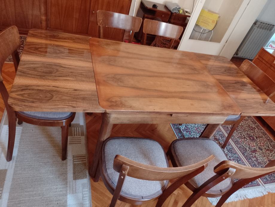 Stola drveni na razvlačenje za 4 ili 6 osoba , politura i stolice 6 kom, tapecirane . Sve je rabljeno ali u vrlo dobrom stanju.