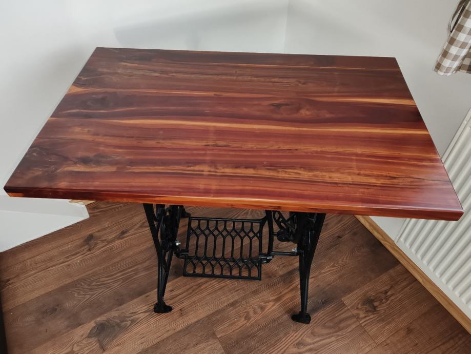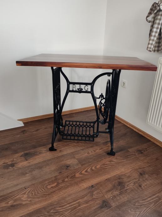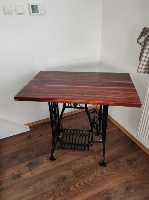 Unikatni stol, postolje od stare sivaće masine, ispjeskareno, nanovo obojano, drvena masivna ploca od šljive kao radna ploha.
