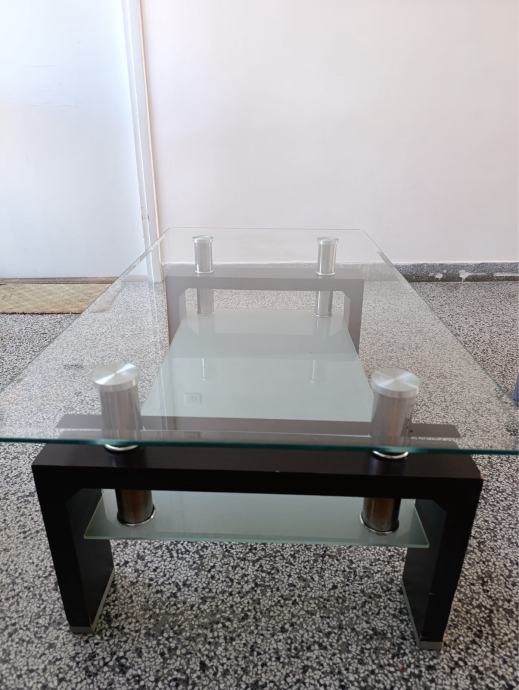 Prodajem stolić za dnevni boravak dimenzija 110x60 cm. Stolić ima staklenu ploču i praktičnu policu ispod, a noge su tamne boje. Funkcionalan i stabilan komad namještaja koji dobro stoji u bilo kojem dnevnom boravku.