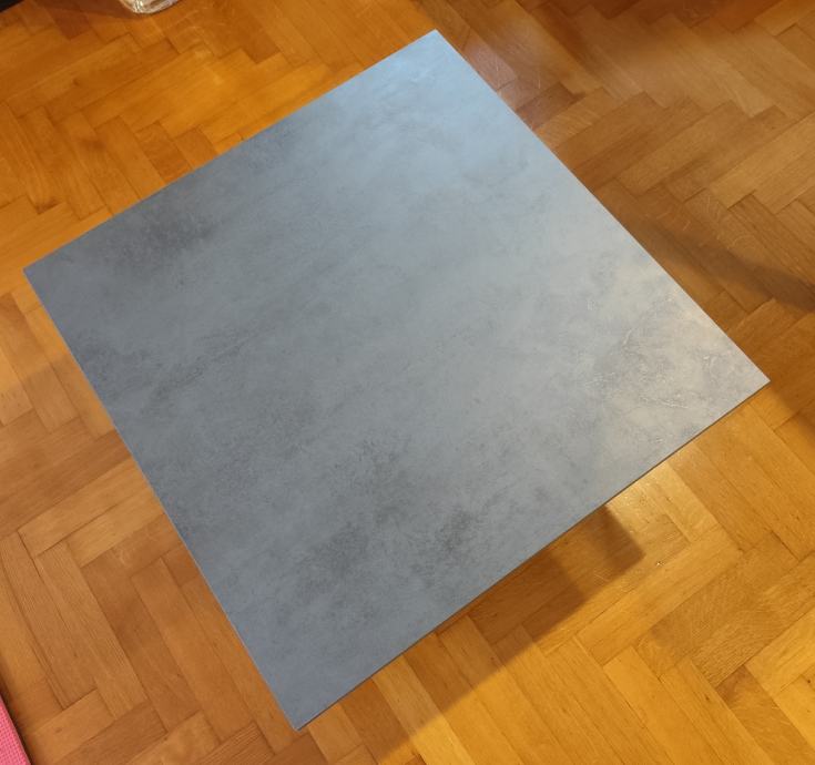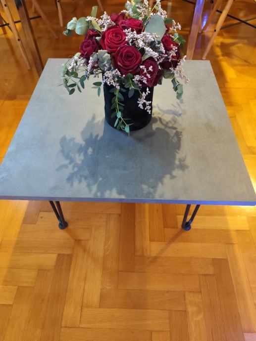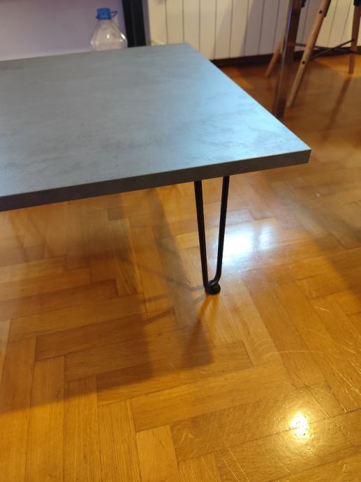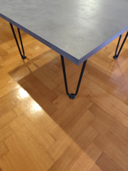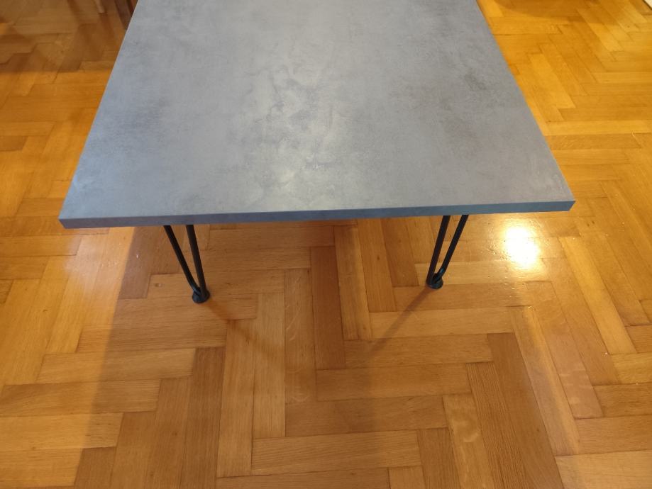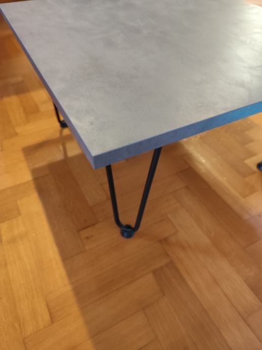 Prodajem novi stolić, 60x60cm, visine 33cm. Ploča-izgled betona, hairpin nogice sa gumenim zaštitom za pod. Materijal: iveral i željezo.