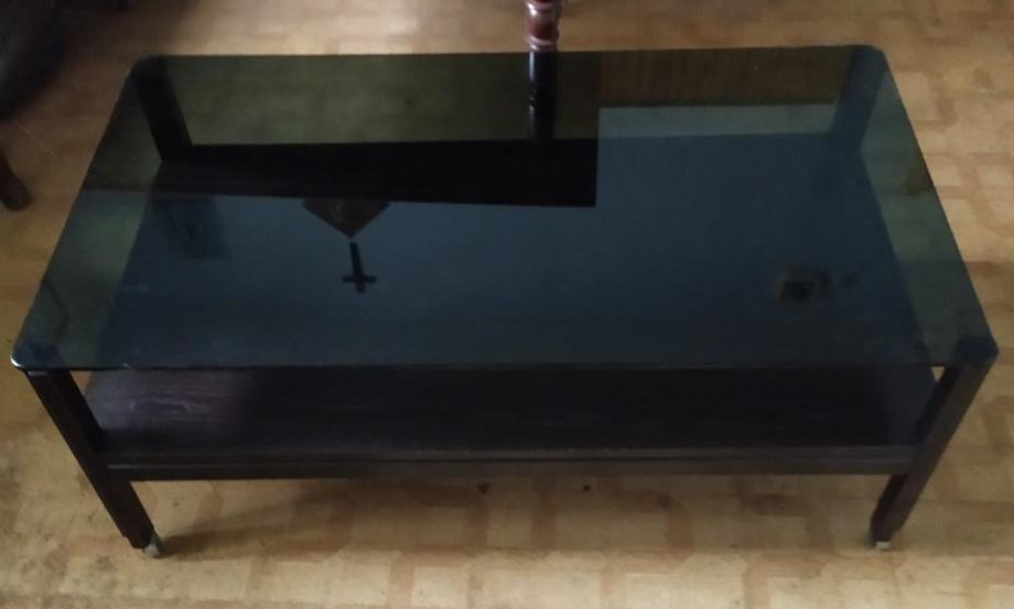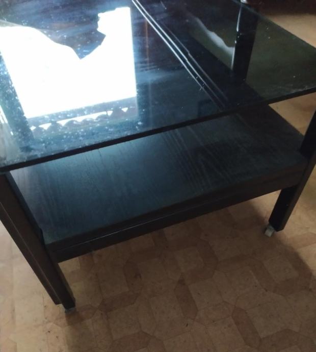 Stolić za dnevni boravak, drvena konstrukcija sa kotačićima na nogama i jednom policom dok je gornja ploha od kaljenog stakla debljine 10 mm, blago matirane boje. Drvena konstrukcija je boje oraha.