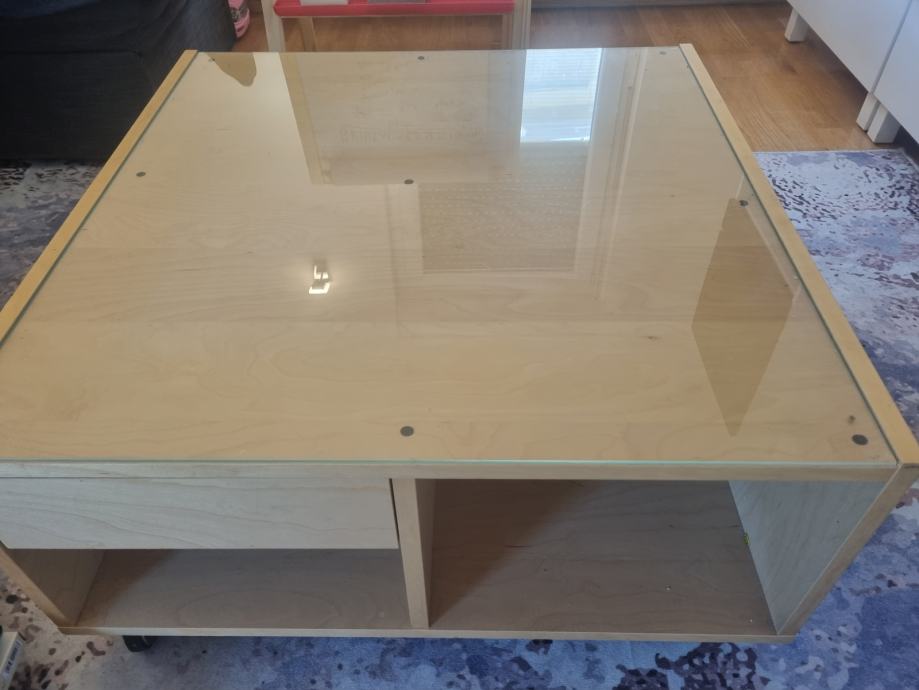 Prekrasan stolić za dnevni boravak..80*80 cm sa kotačićima..visina 40 cm..ima police i jednu ladicu..gore ima staklo..stolić je korišten par mjeseci..kao nov.