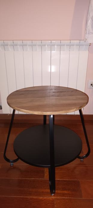 Okrugli; gornja ploča MDF u dekoru tamnog hrasta; polica MDF crne mat boje; noge metalna konstrukcija lakirana u mat crnu boju;podesive stopice na dnu nogica.