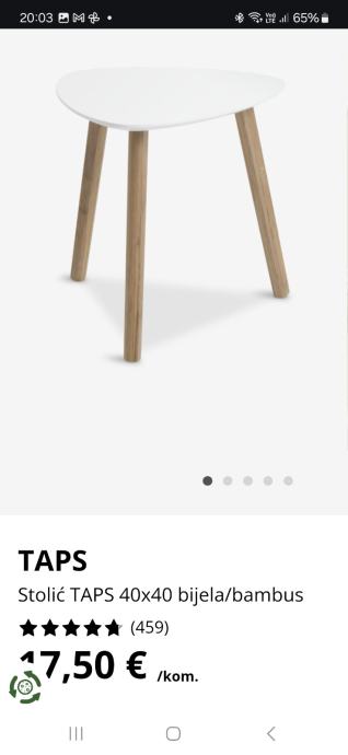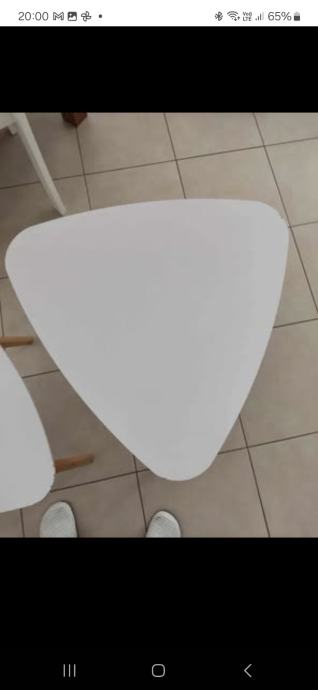 Stolić taps trokutast 40*40 Bambus i medijapan, oštećenja po rubovima kao na slikama.samo vlastito preuzimanje, bez dostava i slanja.kupljen u jysku.