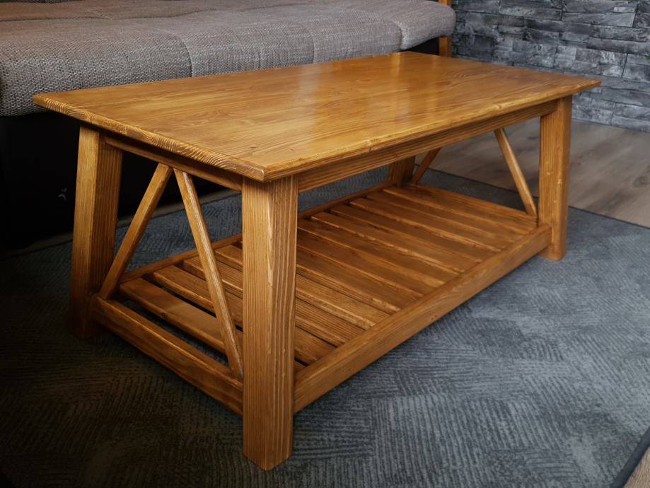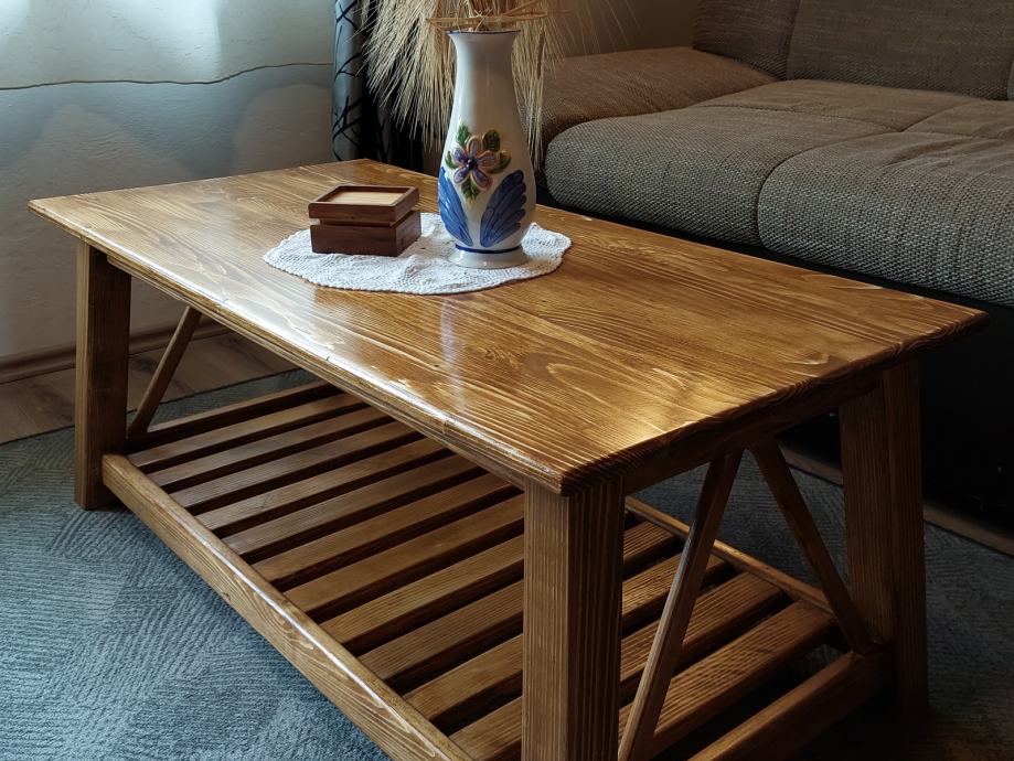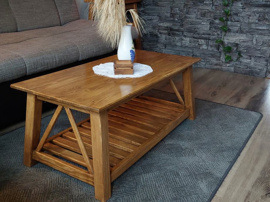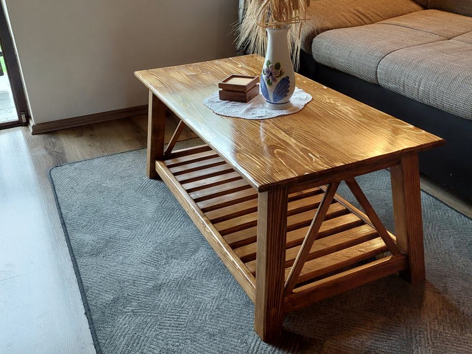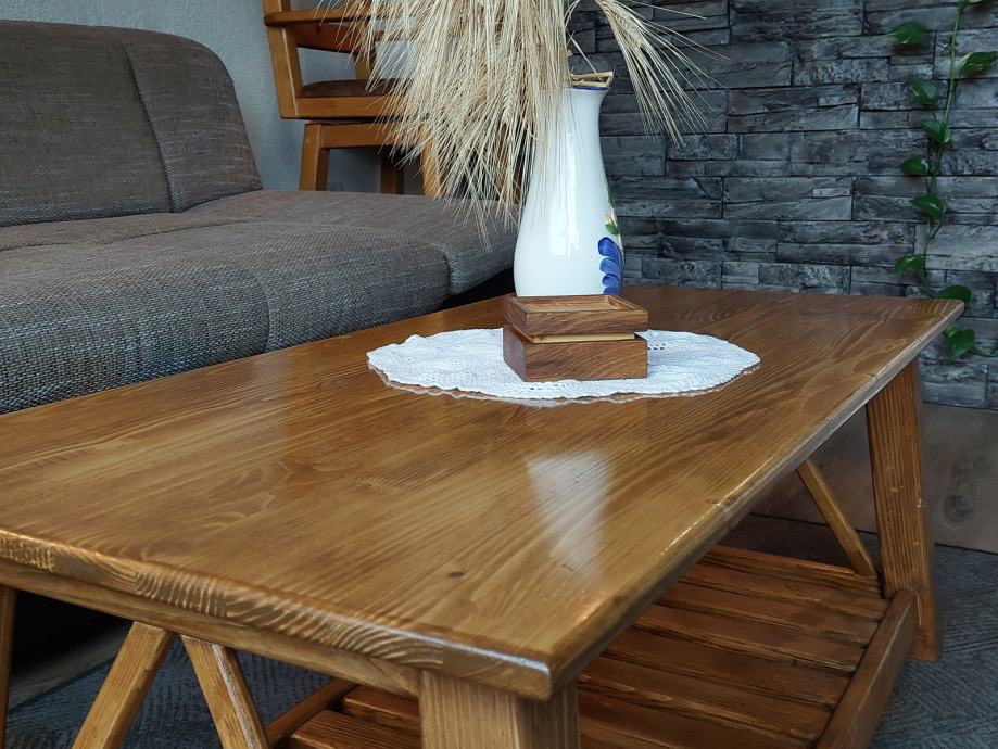Ručno rađeni stolić za kavu od masivne smrekovine. Zaštićen lazurom u boji hrasta. Okvir spojen drvenim klinovima (tiplama) i ljepilom (bez vidljivih šarafa). Gornja ploča pričvršćena je šarafima, što omogućava eventualnu buduću zamjenu. Stabilan i lagan, s toplim, prirodnim dojmom. Dimenzije: 100x50x42 cm.