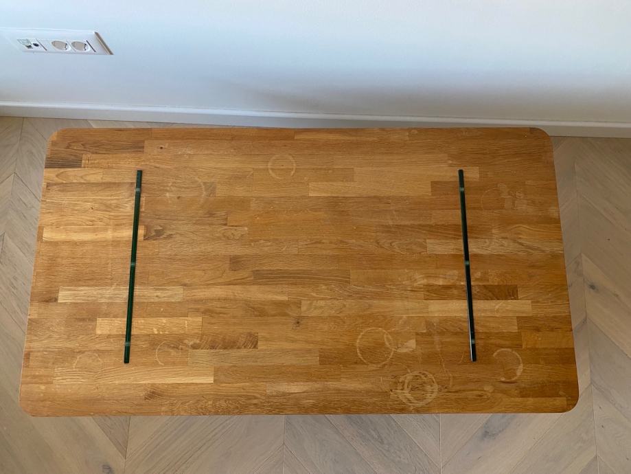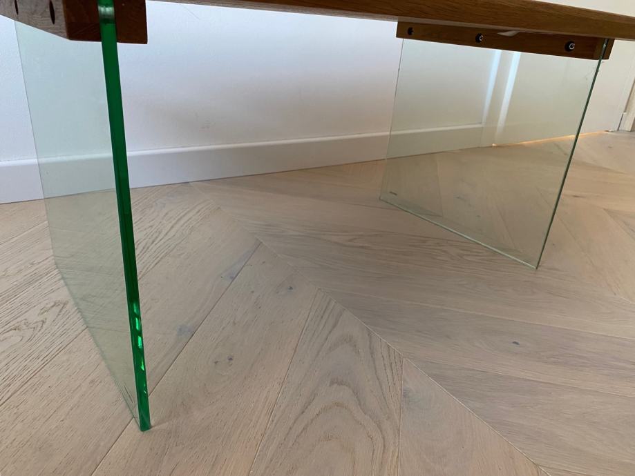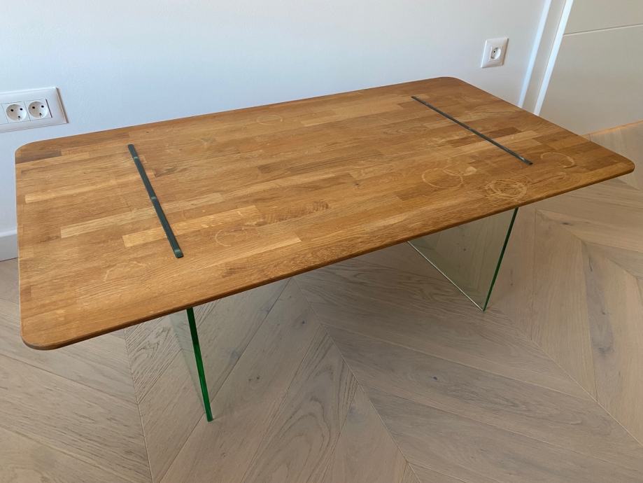 Rabljeni stolić sa pločom od masivnog drva i nogama od temperiranog stakla.