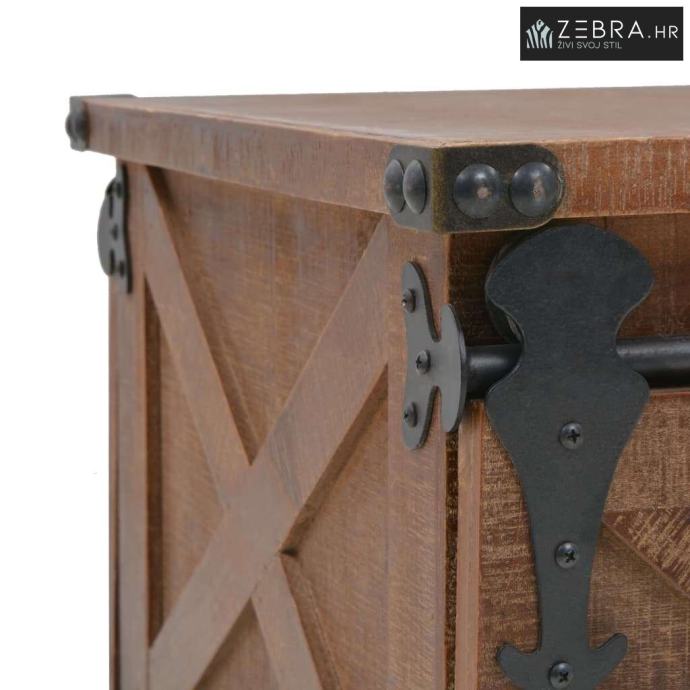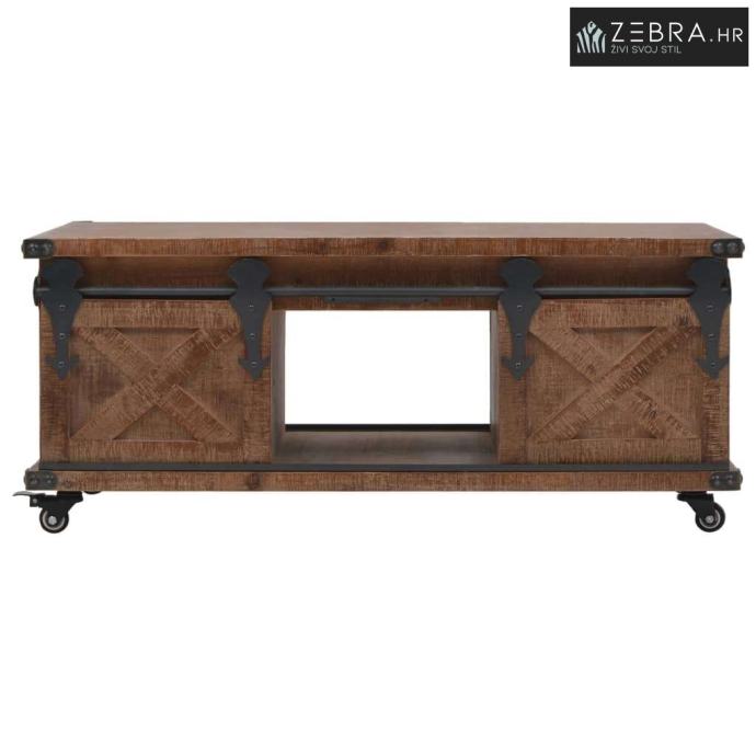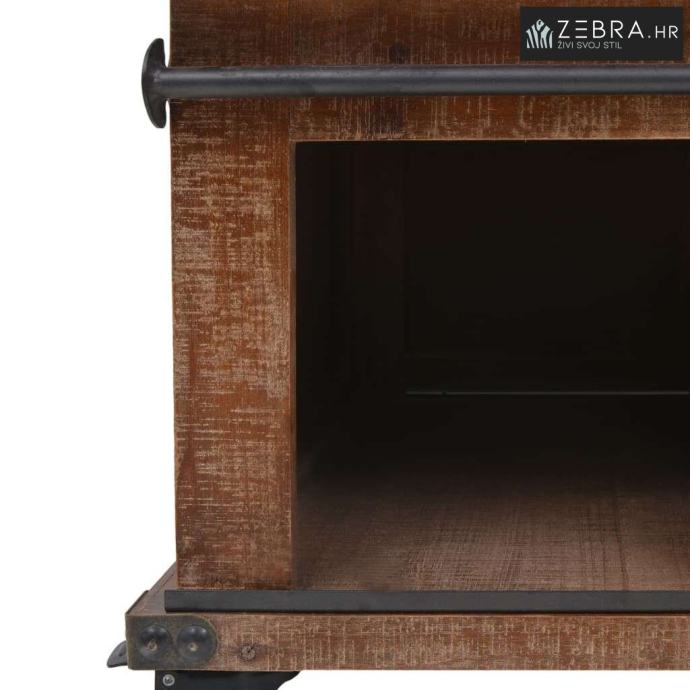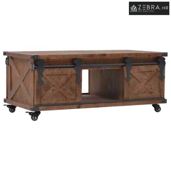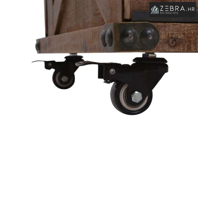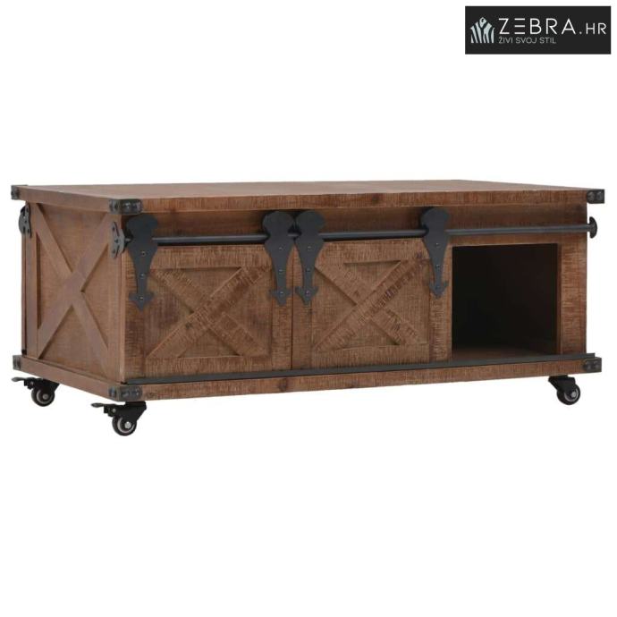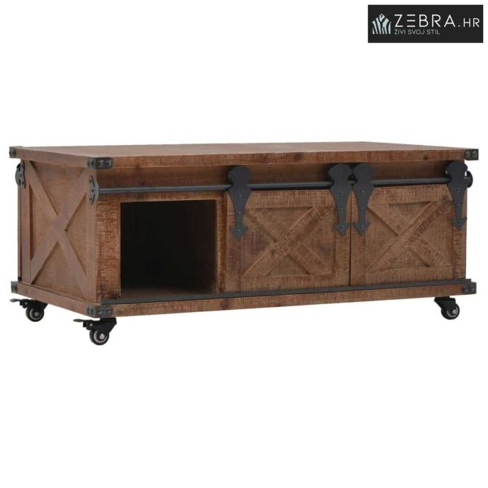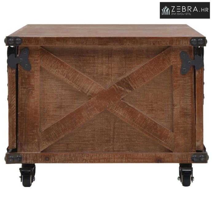 Ovaj vrlo stabilan i izdržljiv bočni stolić izrađen je od masivne jelovine, koja odiše starinskim šarmom i daje mu rustične karakteristike. Čvrsta površina idealna je za postavljanje košara s voćem, vaza ili nekih drugih ukrasnih predmeta. Stolić za kavu ima dovoljno prostora za čuvanje raznih predmeta uredno organiziranima. Jedinstven dizajn s kliznom vodilicom omogućuje lako otvaranje i zatvaranje vrata i također pridonosi starinskom i industrijskom stilu stolića. Stolić je dizajniran s četiri fleksibilna kotačića za pomicanje po kući.