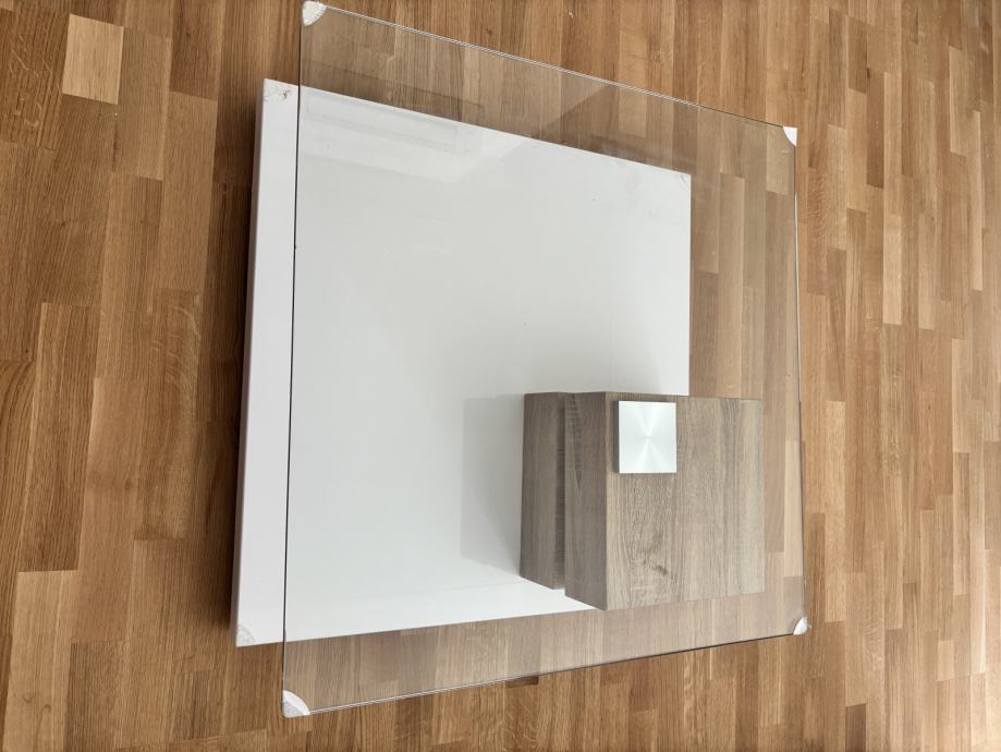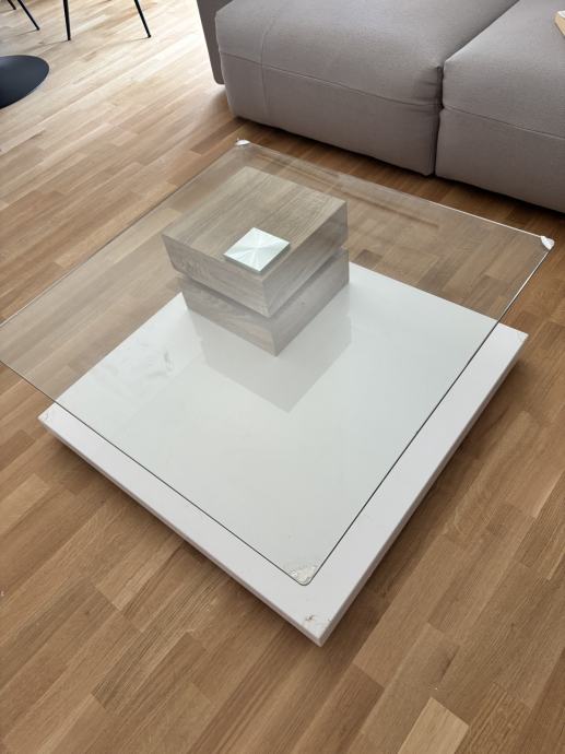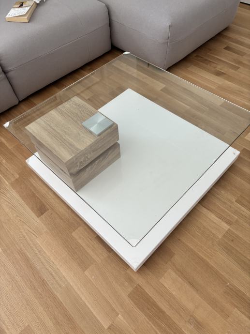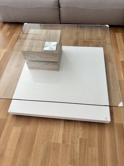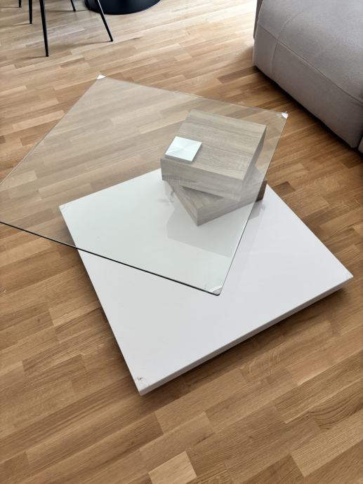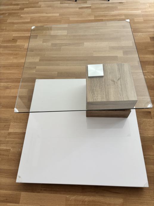 Prodajem ocuvani stolic za dnevni boravak 80 x 80 x 35 gornji stakleni dio se moze rasklopiti i okretati (vidljivo na slici), na rubovima su bile zalijepljene zastite koje treba poskidati