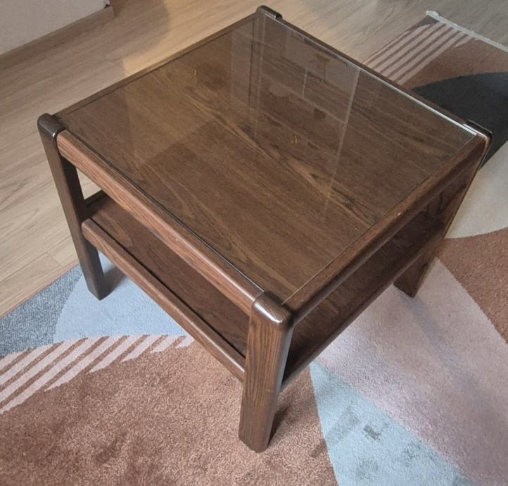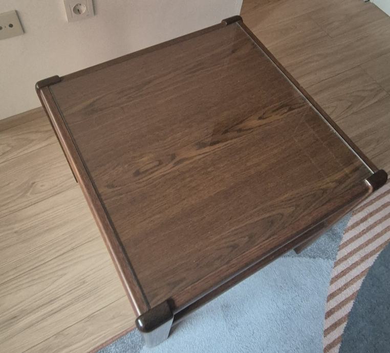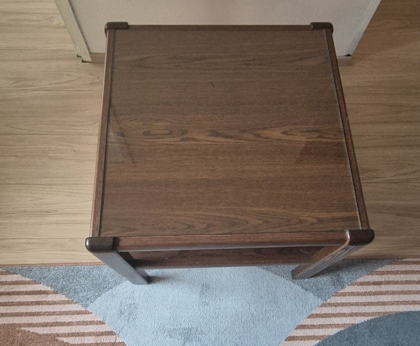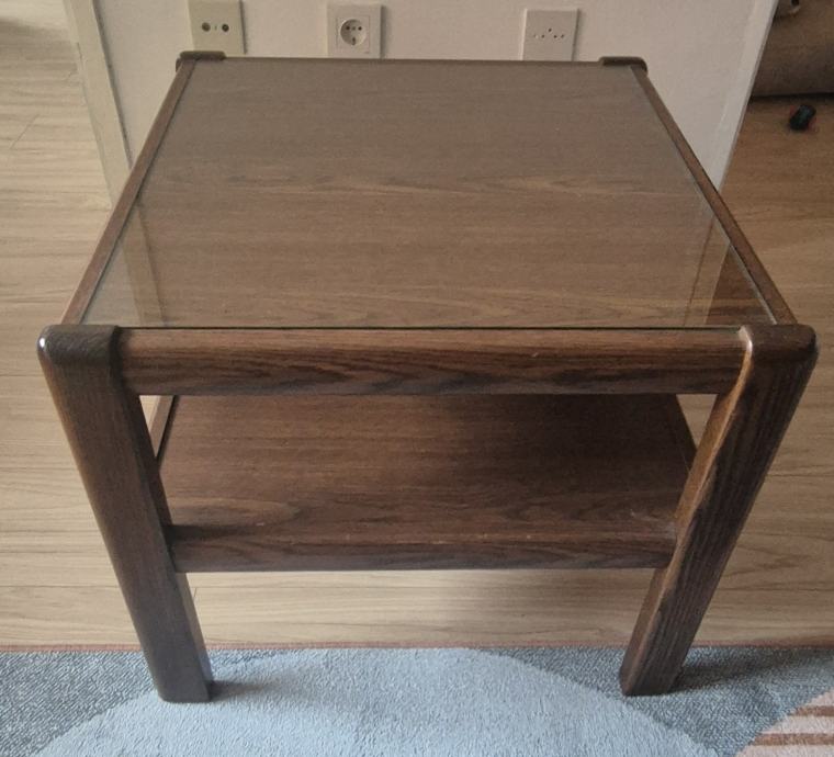 Prodajem vrlo očuvan i čvrst klub stolić izrađen od masivnog hrasta s umetnutom staklenom pločom. Š 55cm, D 55cm, V 50cm.